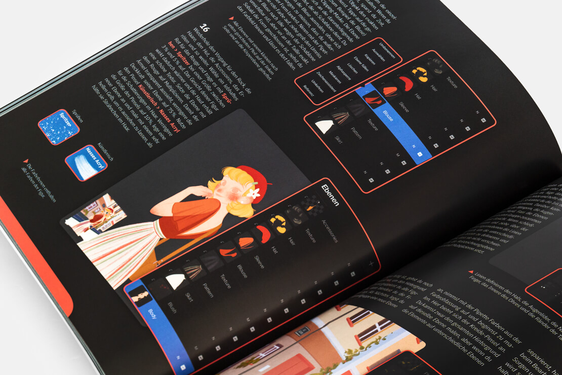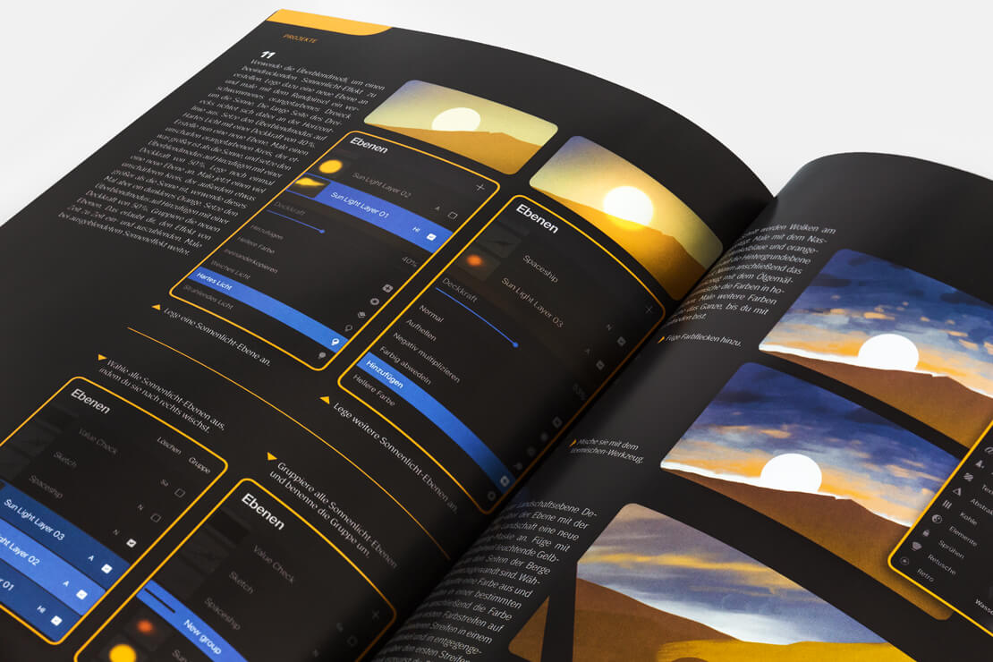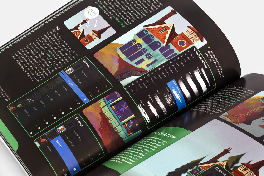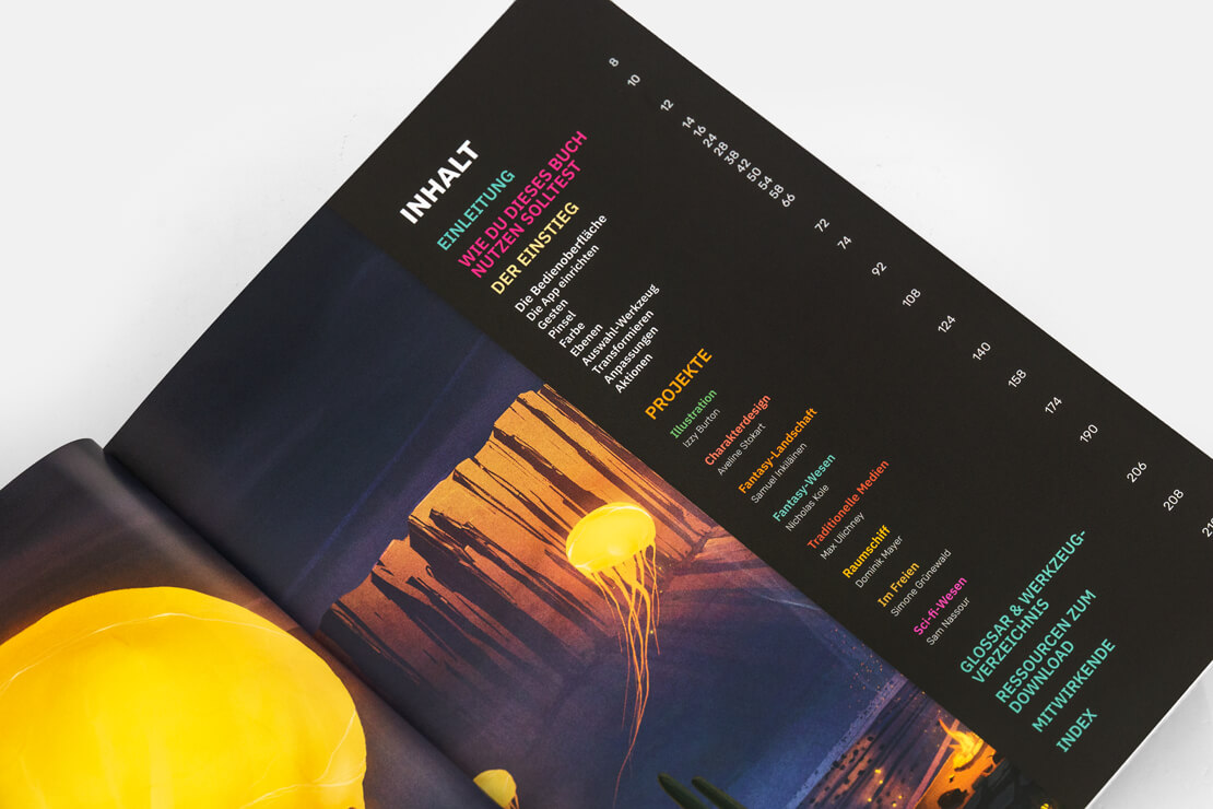 Acht Tutorials von Izzy Burton, Samuel Inkiläinen, Simone Grünewald, Nicholas Kole, Dominik Mayer, Lucas Peinador, Sam Nassour, Aveline Stokart und Max Ulichney bilden die Highlights des Buches und zeigen, wie sich »Digital Paintings« mit der App malen lassen.