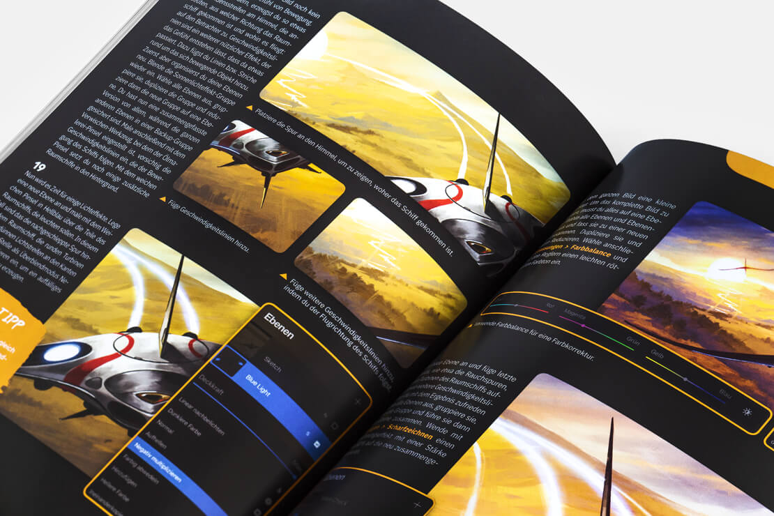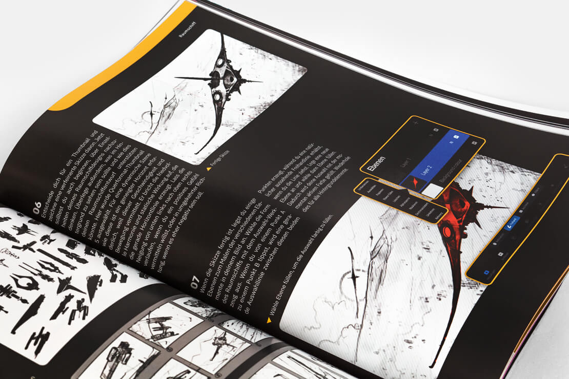 Schritt-für-Schritt geht es von den ersten Strichen zum fertigen Bild. Dieses geschieht meistens auf mehreren Seiten. Ein Tutorial entspricht dabei vom Umfang her in etwa einem Buchkapitel. Erklärt werden beispielsweise auch Zwischenschritte und Details, die beim Gestalten von modernen Comic-Charakteren, fantasievollen Landschaften oder Science-Fiction-Szenen wichtig erscheinen.