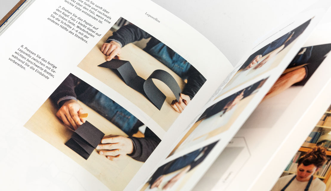 Die vielen Fotos zeigen, wie sich Blätter falten, kleben, verleimen oder mit einem Faden zusammenbinden oder verknoten lassen, um schließlich Leporellos mit dekorativem Papiereinband, individuelle Einbände mit offenem Rücken, mehrlagige Festeinbände etc. selbst herzustellen.