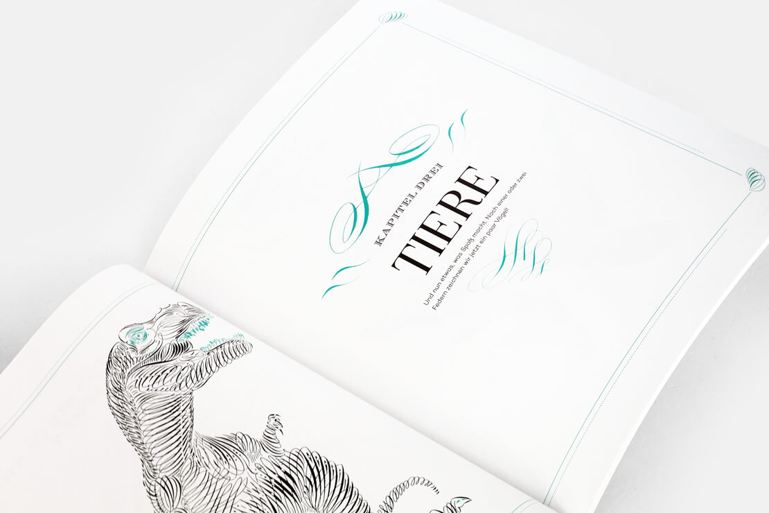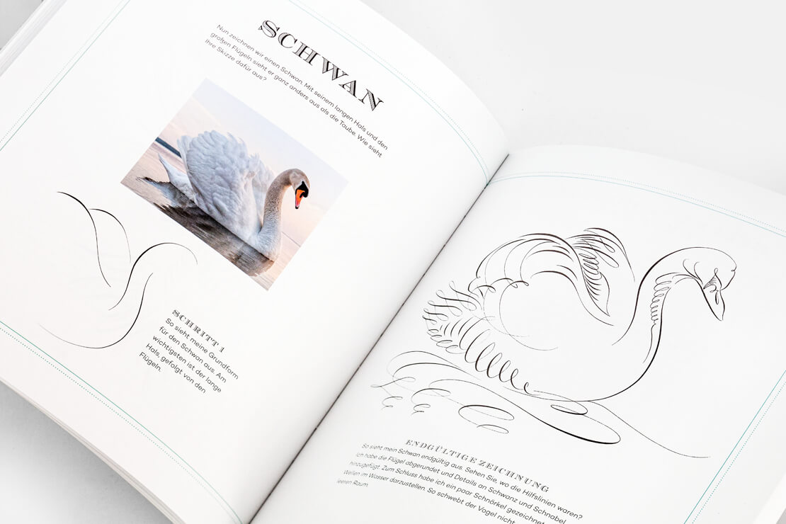 Neben der geeigneten Wahl von Feder, Federhalter und Tinte ist zu sehen, auf welche Weise sich kalligrafische Methoden verwenden lassen, um ausdrucksstarke Illustrationen zu zeichnen. Die Tutorials beginnen zunächst mit einfachen Strichen und Schnörkeln. Später geht es dann in den Workshops um komplexe Darstellungen in Form von Tieren.