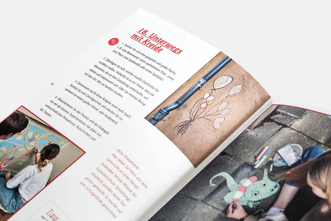 Beschrieben wird unter anderem, wie man Naturmaterial einbinden kann, mit Tape Art experimentiert, Mosaikbilder legt, durch »Guerilla Knitting« Farbe in den Alltag bringt oder mit den Kräften der Natur arbeitet, um beispielsweise Schattenspiele zu kreieren, Abdrücke in Ton zu erstellen, eigene Zeichenkohle herzustellen oder Eisskulpturen zu erschaffen.