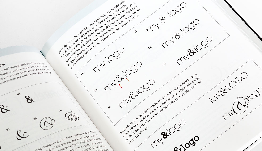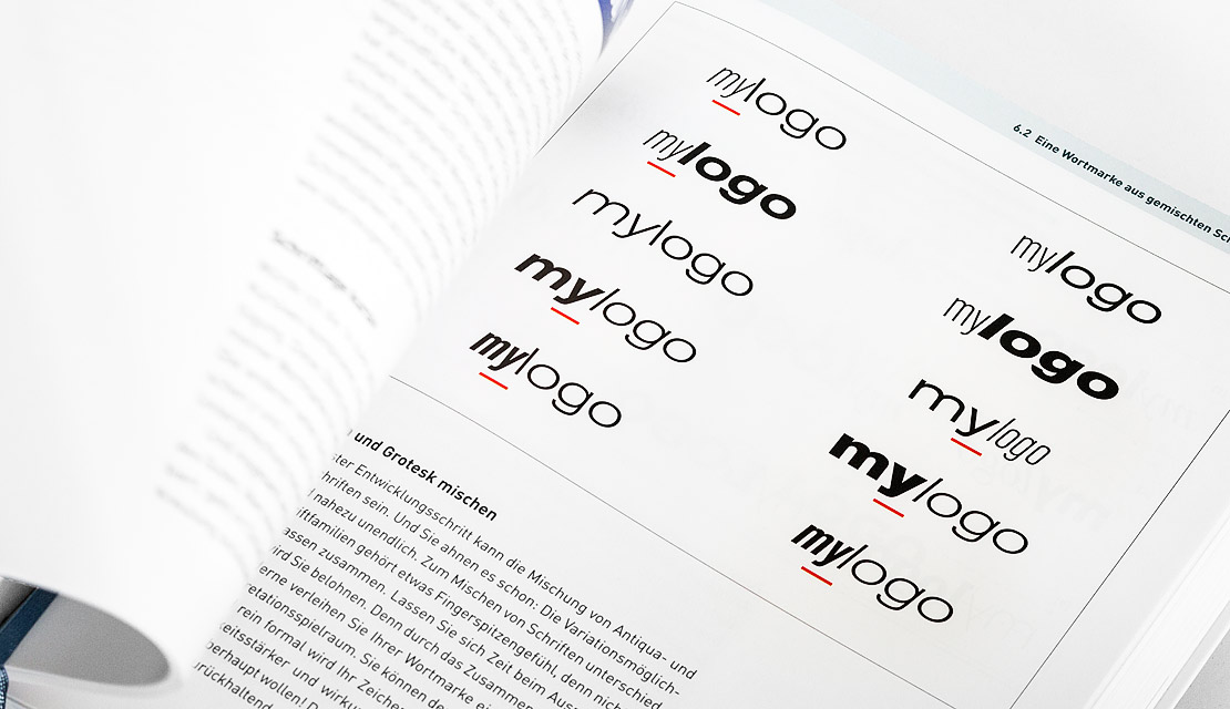 Als hilfreich erweisen sich dabei die Darstellungen der fiktiven, beispielhaften Gestaltungen von Logos. Die vielen Variationen präsentieren auf einem Blick, wie sich systematisch oder auch spielerisch mit Formen und Positionen von Elementen experimentieren lässt. So lassen sich weitere Möglichkeiten der Gestaltung in Betracht ziehen, um Wortmarken und Co. einen bestimmten Look zu verleihen.