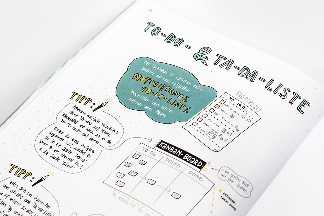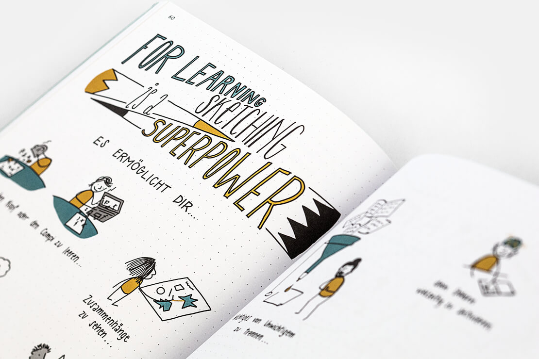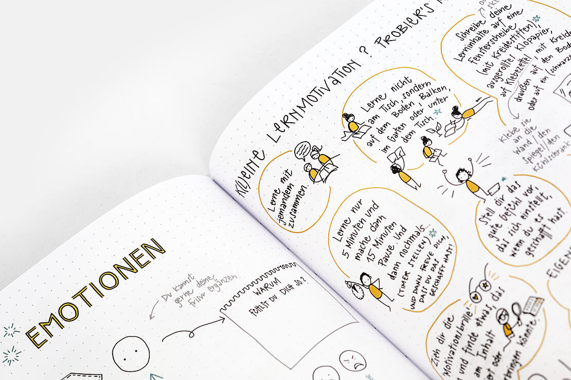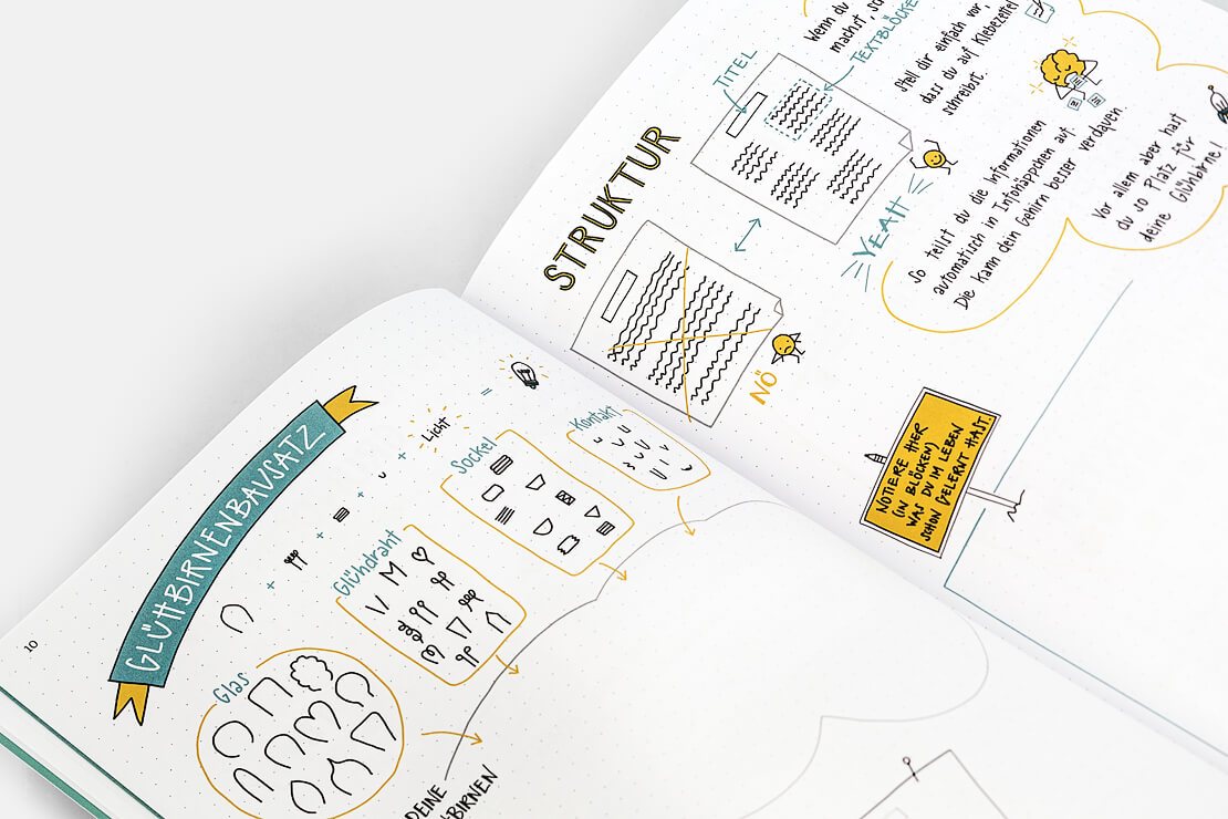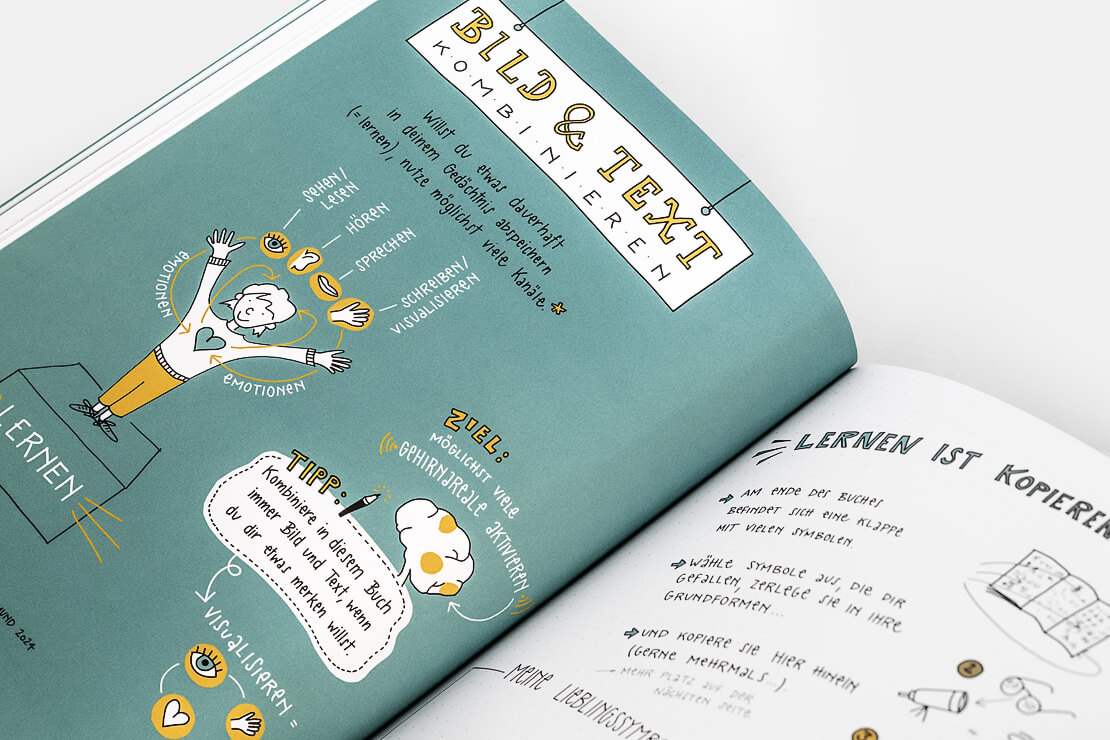 Anstatt auf ein leeres Blatt zu blicken, bietet das 96 Seiten starke Buch bereits erste Impulse: Visualisierungsbeispiele, Gestaltungsideen und zahlreiche Anregungen regen zum Mitmachen an. Sketchnotes, Mindmaps oder kleine Zeichnungen – der kreative Zugang zu Lerninhalten wird bewusst einfach und nachvollziehbar gehalten.