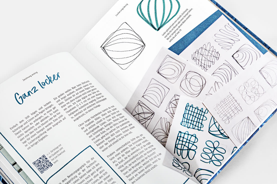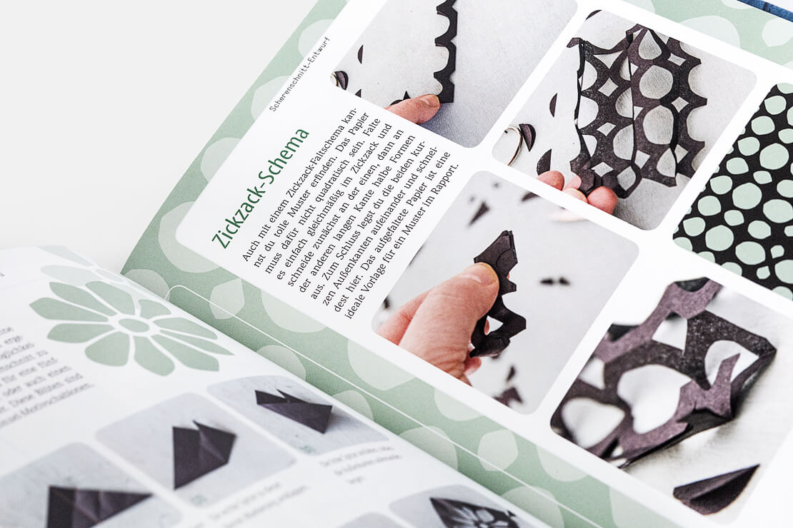 In »Schnipsel und Pixel« finden sich zudem Adressen zu Videos, die einzelne Schritte im Detail erklären. So erfährt man, wie sich beispielsweise Gummiband-Bindungen für Taschenkalender, Scherenschnitte, Muster aus digitalen Motiven oder auch Collagen anfertigen lassen.