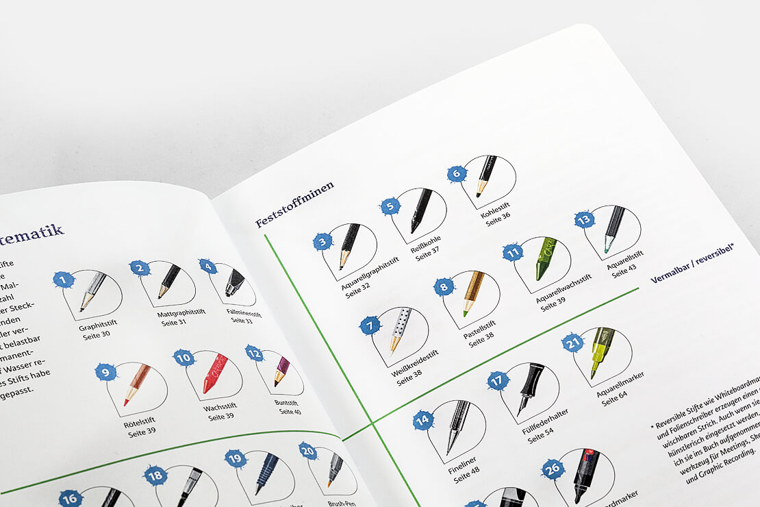 Das Buch beginnt mit einer detaillierten Übersicht über verschiedene Stifte, geordnet nach Kriterien wie der Beschaffenheit der Mine und dem Verhalten auf Papier. Die einzelnen Steckbriefe geben eine kurze Zusammenfassung der Eigenschaften jedes Stifts und bieten somit eine Orientierung für alle, die passende Werkzeuge für ihre kreativen Projekte suchen.
