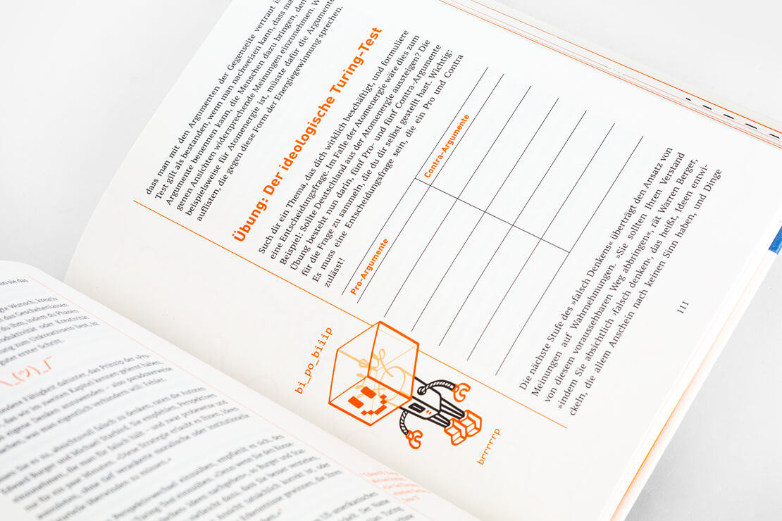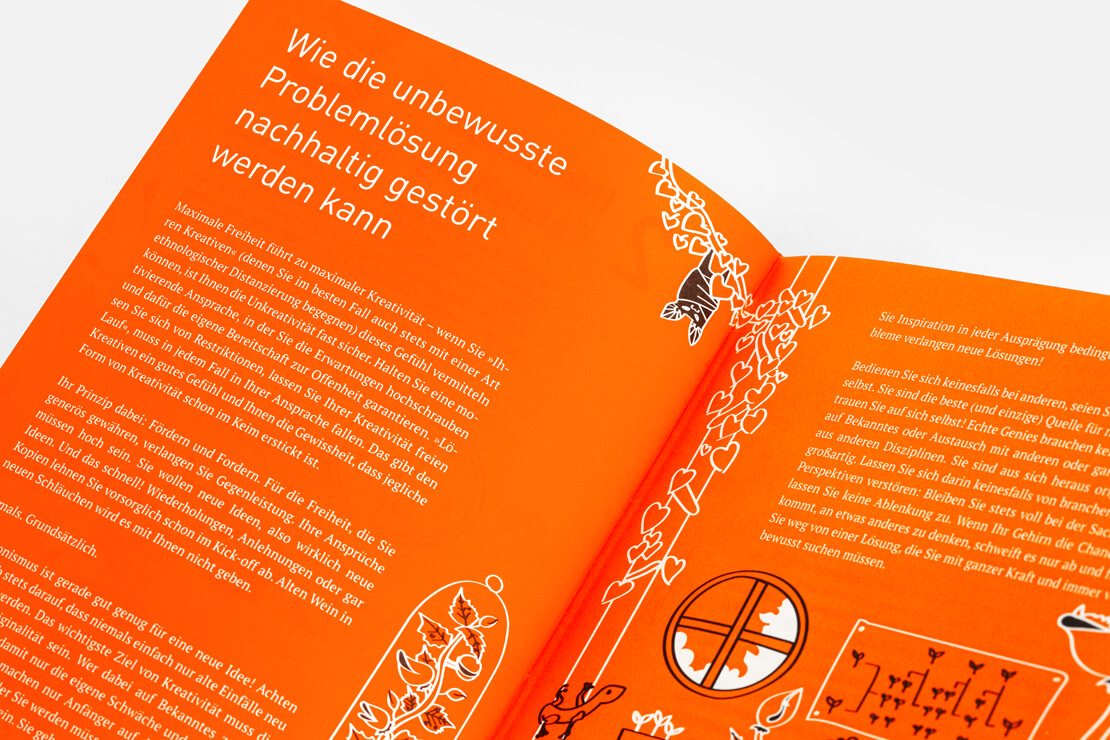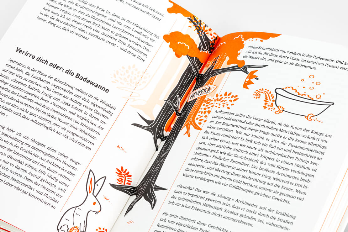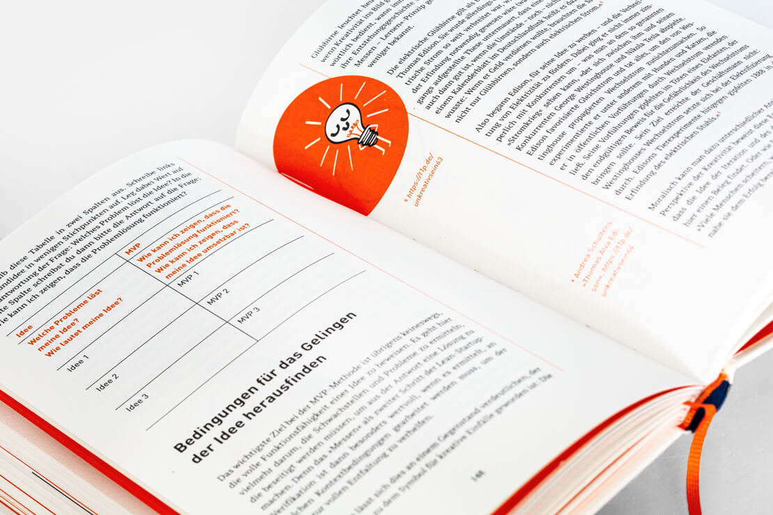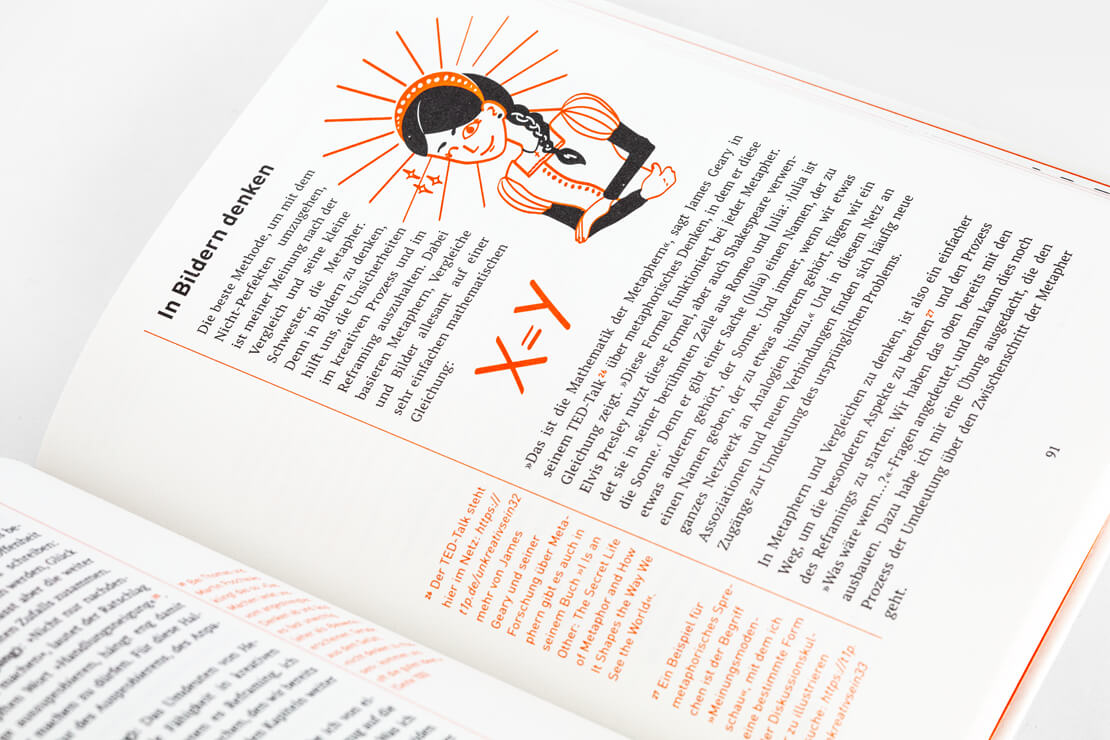 Interessanterweise geht dieser Ratgeber mal einen anderen Weg und dreht den Spieß einfach um: Jedes Kapitel beginnt mit orangefarbenen Seiten, die ironische oder satirische Sichtweisen liefern und beispielsweise erläutern, wie man sich ganz sicher und zielgerichtet so richtig unkreativ geben kann.