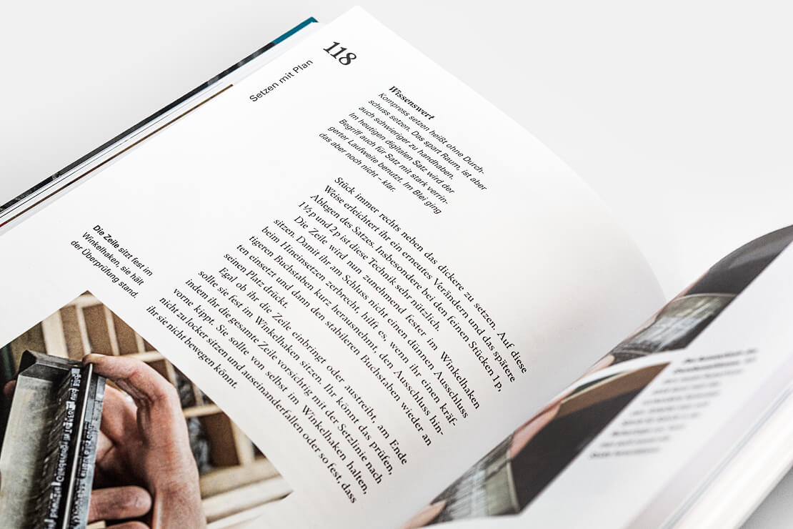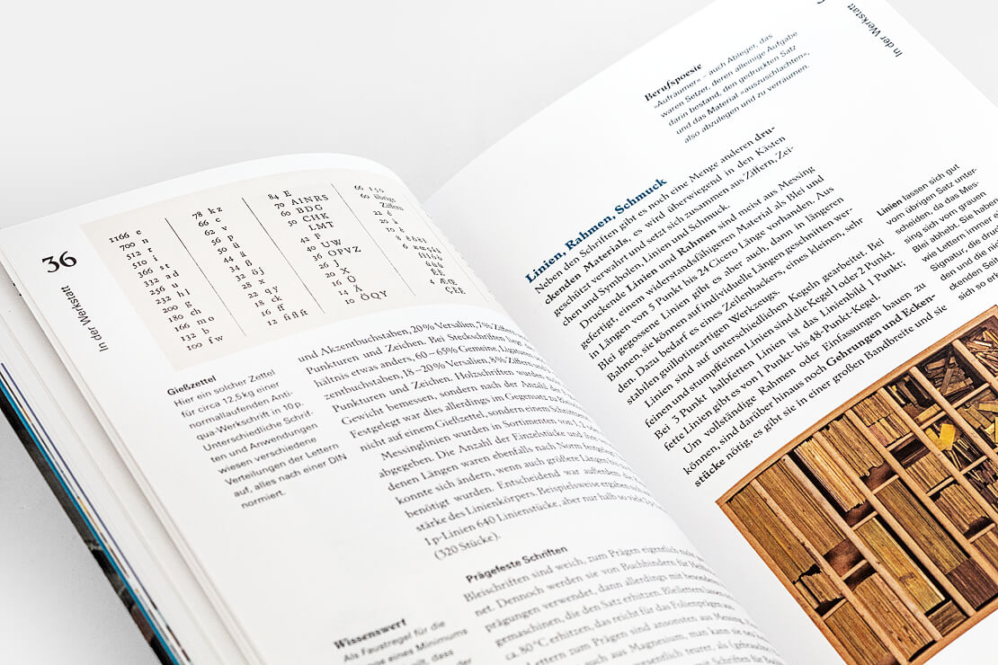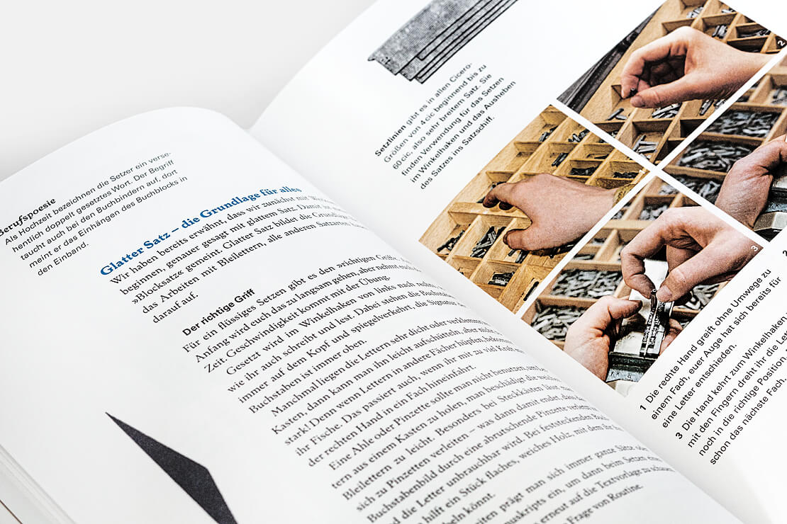 Sichtlich viel Mühe hat man sich mit den vielen Fotos im Buch gemacht. Nahezu jede Seite wird mit mehreren Abbildungen ergänzt. Dazu kommt Material aus der Historie des Bleisatzes sowie neue Aufnahmen, die beispielsweise bei Anleitungen zum Einsatz kommen und bestimmte Abläufe erklären.