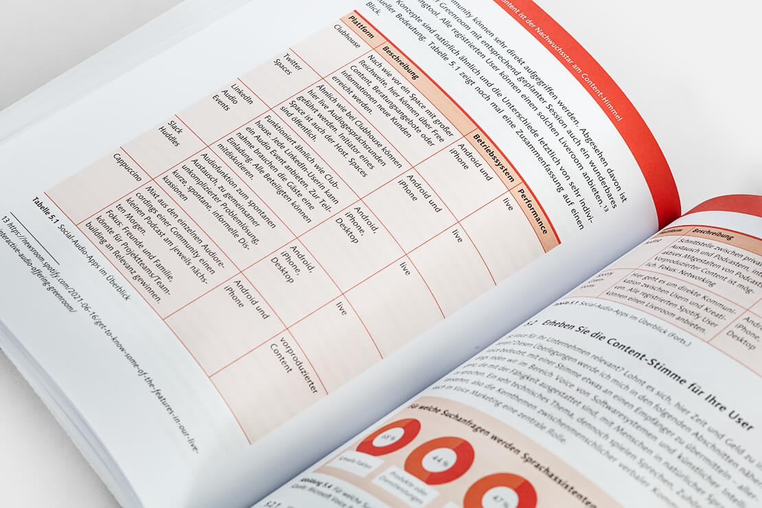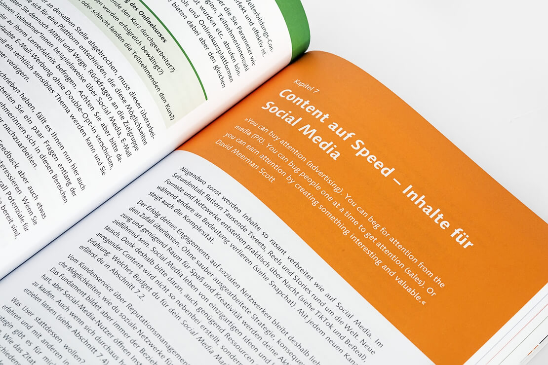 »Content 360 Grad« ist in verschiedene Kapitel unterteilt, die sich mit den Grundlagen des Content-Marketings, dem Königsformat Text, gutem Design, der gekonnten Inszenierung von Videos, der Renaissance des Audio-Contents, dem Begeistern von Kunden mit Wissen, Content im B2B, Shop-Content und Aus- und Weiterbildungsmöglichkeiten befassen.