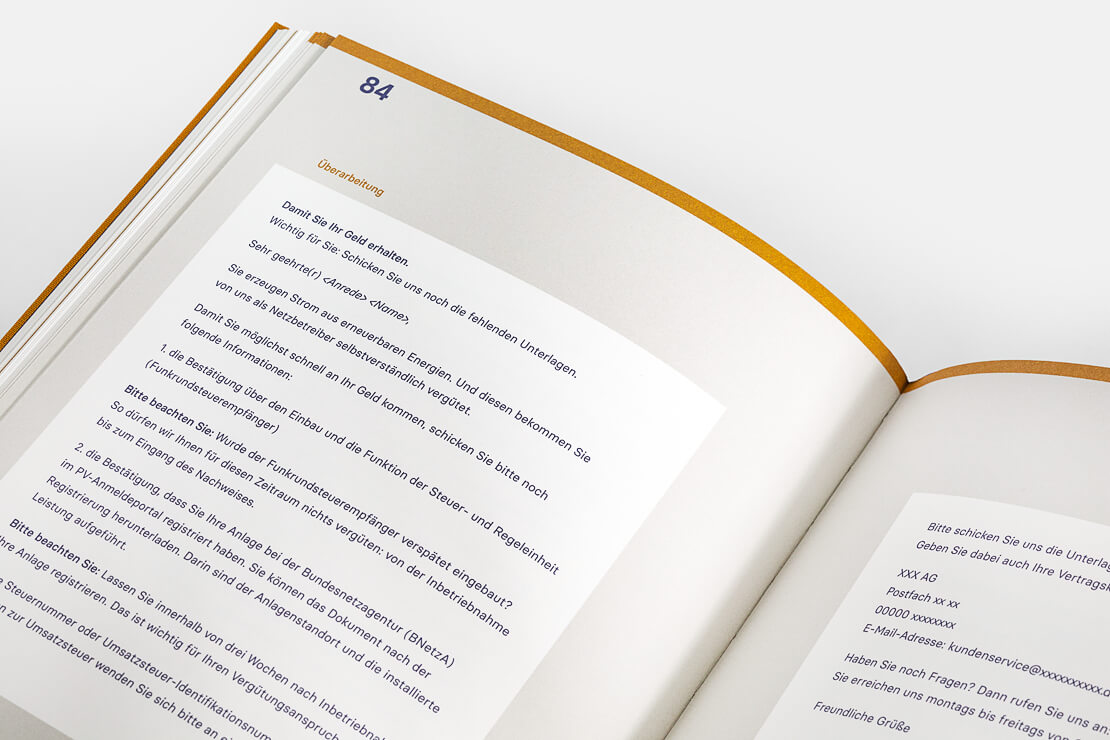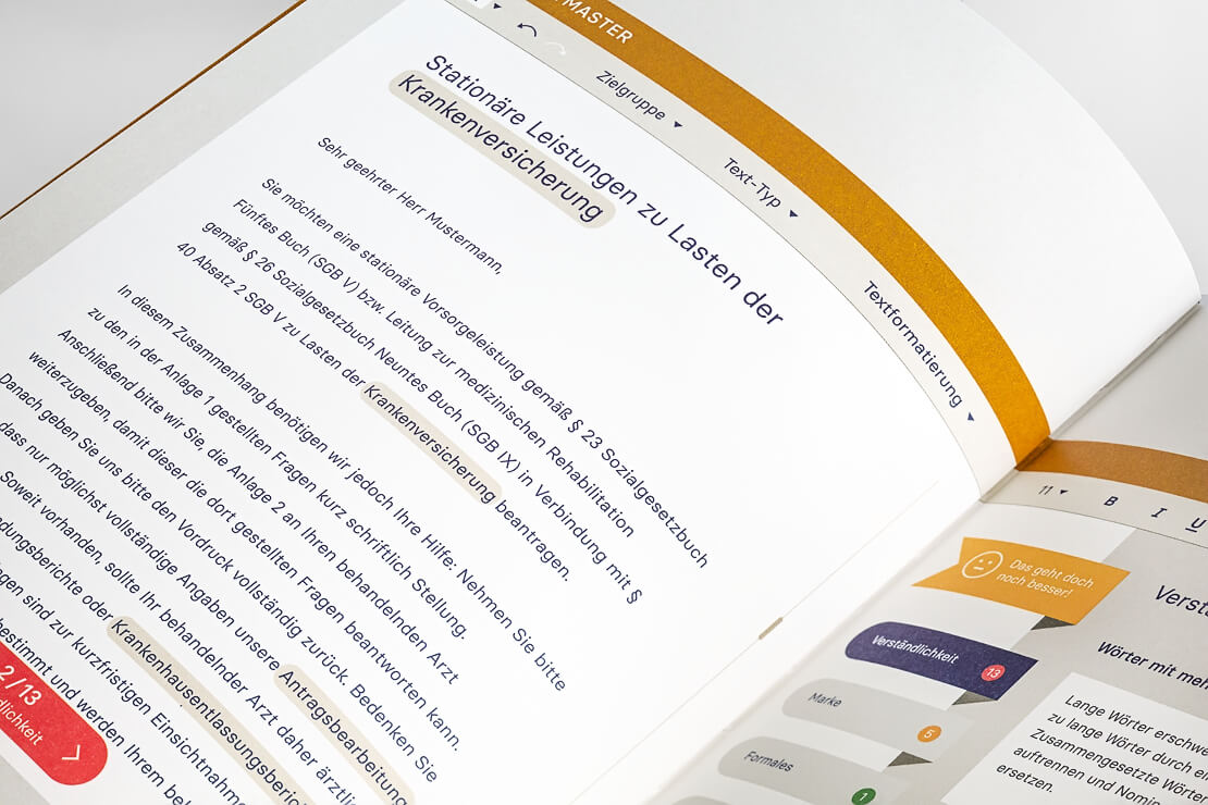 Lesenswert sind auch die zahlreichen Vorher-Nachher-Beispiele. Auf den linken Seiten findet man den Originaltext sowie entsprechende Randbemerkungen, die aufzeigen, was dabei sprachlich nicht so ideal gelaufen ist. Die rechte Seite zeigt den final überarbeiteten Text, in dem alle »Hürden« beseitigt wurden.