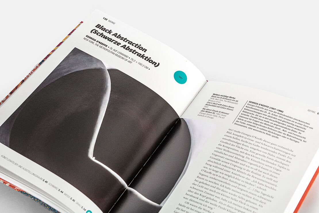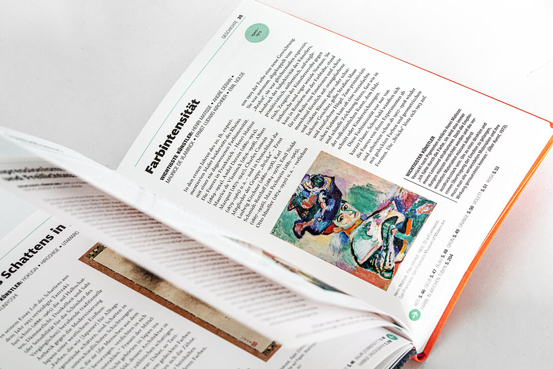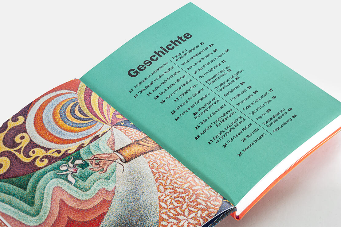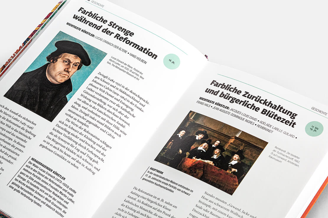 Der Bereich »Geschichte« geht zum Beispiel auf Newtons Farbkreis ein, untersucht die Hell-Dunkel-Malerei und das Spiel mit der Optik. Im Kapitel »Symbolik« wird die Bedeutung von Farben behandelt.