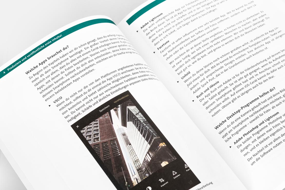 Außerdem erfährt man, welches Equipment benötigt wird und worauf beim Fotografieren oder Filmen geachtet werden sollte. Auch das Finden des eigenen Stils, die Wahl der passenden Hashtags, die Veranstaltung von Gewinnspielen und Co. werden in einem separaten Bereich gesondert behandelt.
