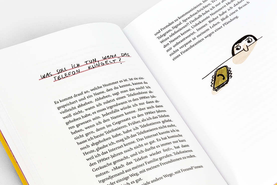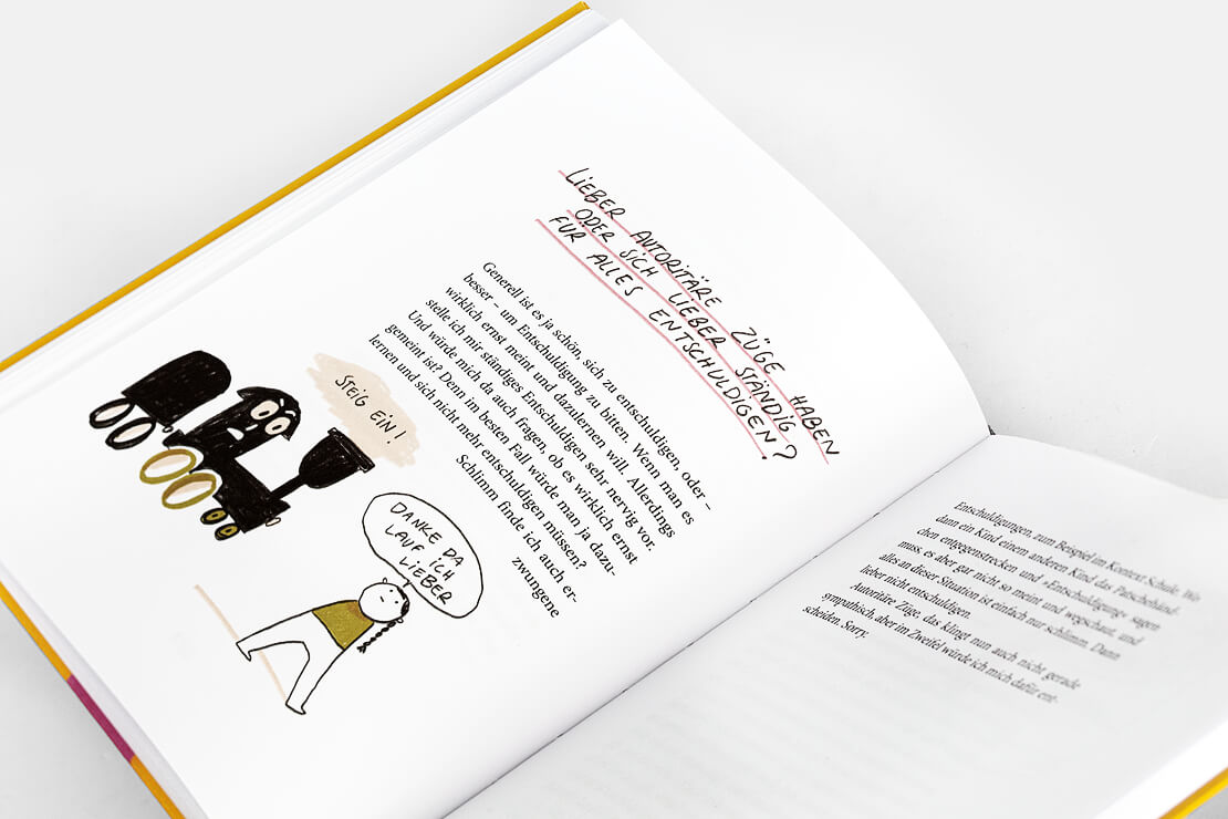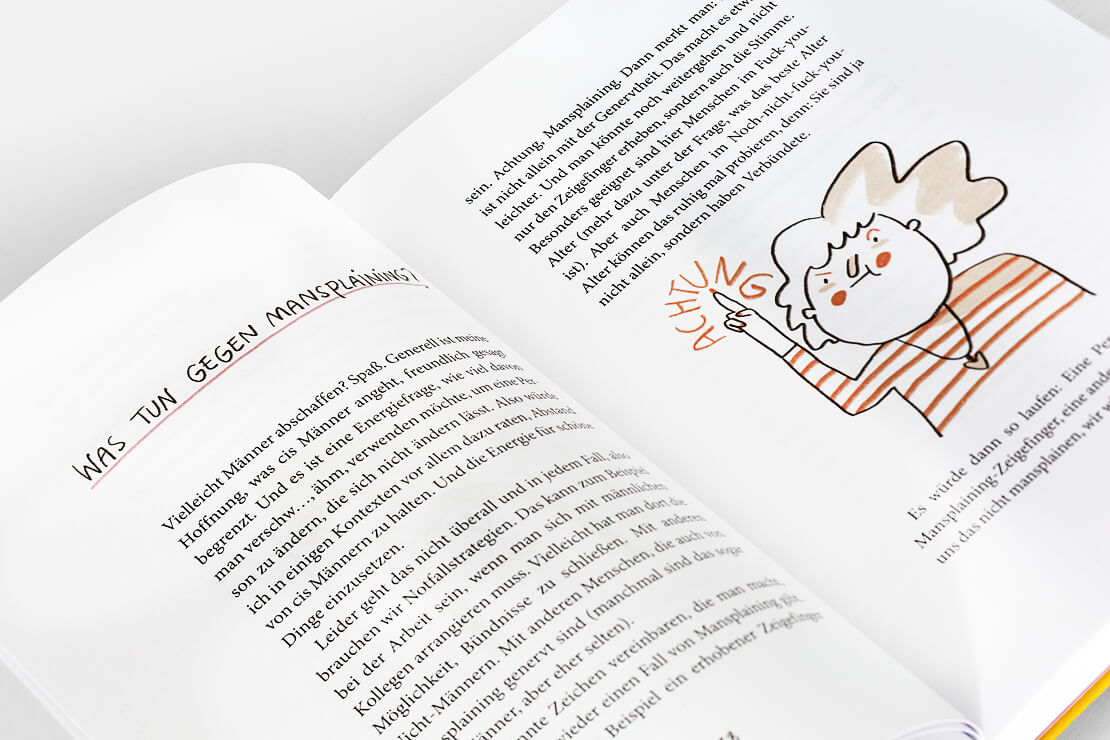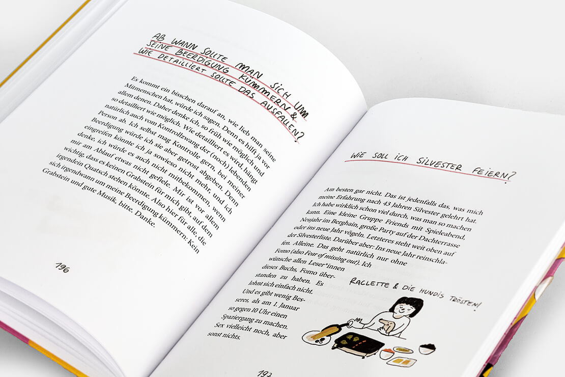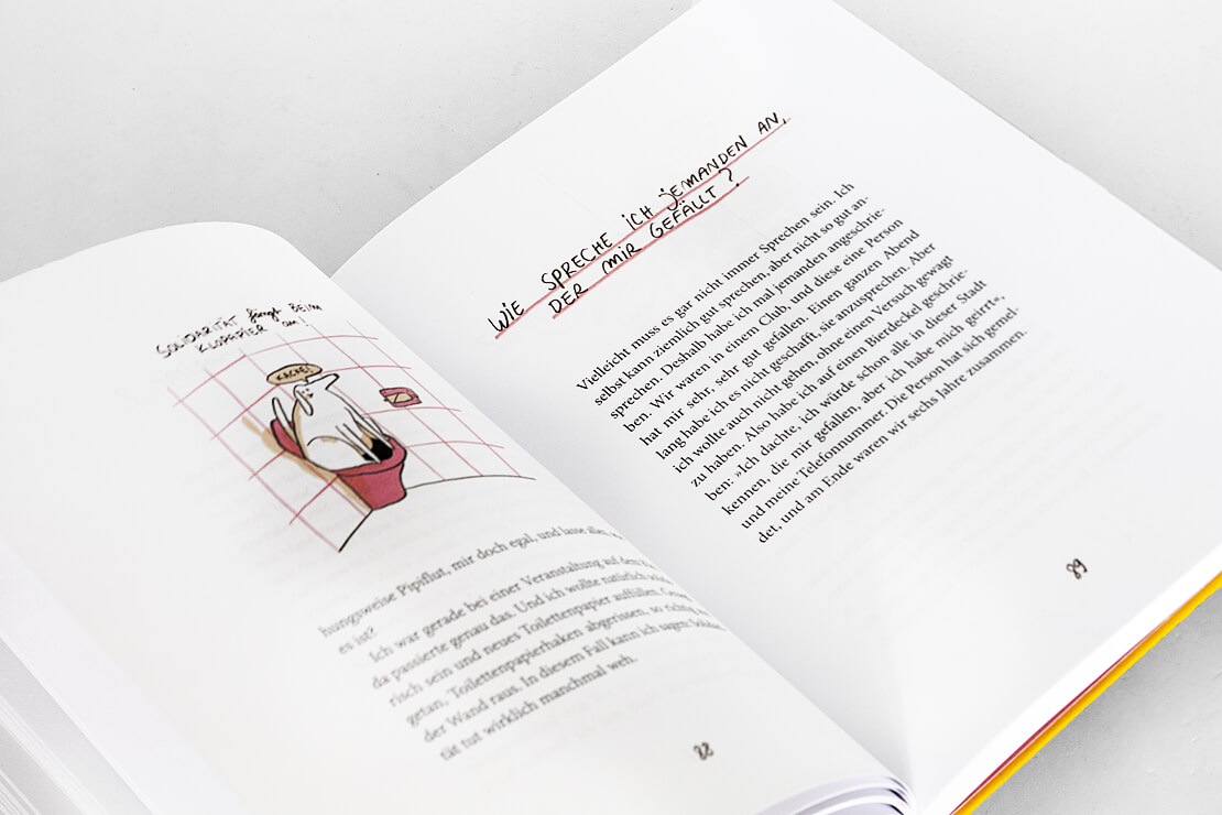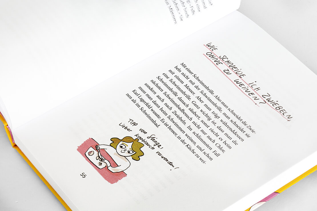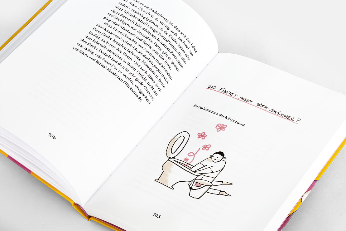 Begleitet werden die Texte von rund dreißig farbigen Illustrationen der Künstlerin Slinga, deren klarer Strich die Selbstironie des Buches visuell verstärkt.