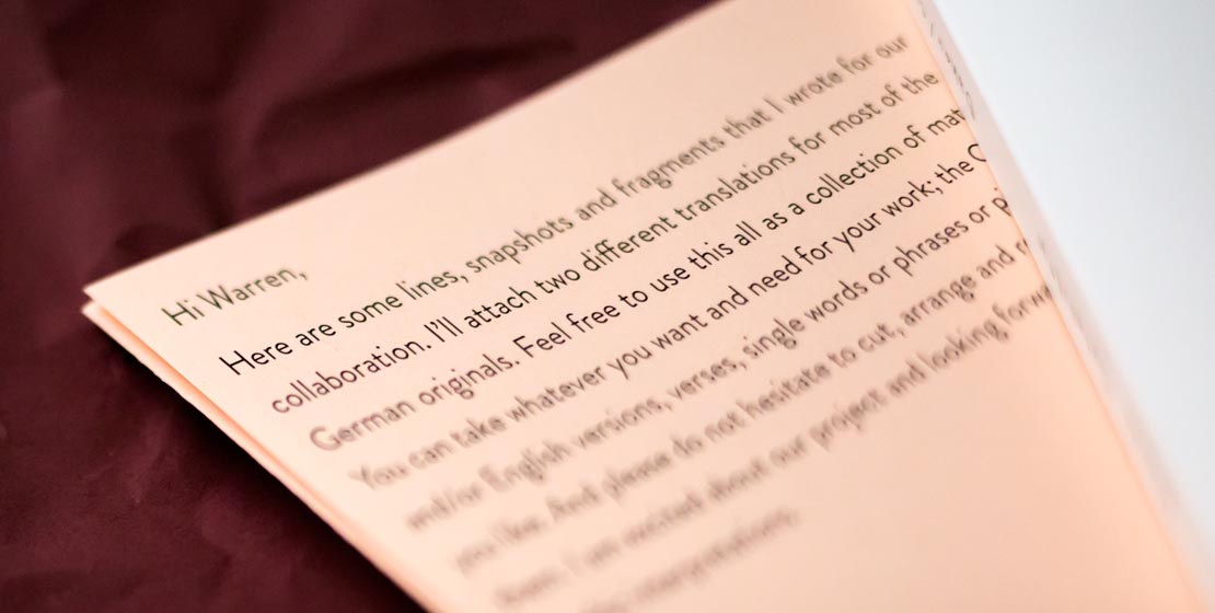Die Verse von Lydia Daher liegen dem Buch separat in einem Faltblatt bei. Dieses enthält außerdem ein kleines Anschreiben der Lyrikerin sowie die englischen Übersetzungen, die dem Illustrator zusätzlich zur Verfügung gestellt wurden. Die Zweisprachigkeit hat Warren Craghead bewusst in seine Bleistiftzeichnungen einfließen lassen. Dadurch entstanden auch zusätzliche Interpretationen und Deutungsmöglichkeiten.