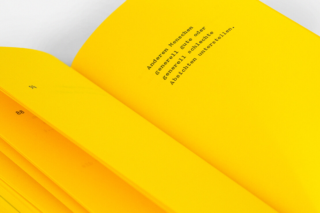 Die »Königswege zum Unglück« wurden von Jenna Gesse typografisch in Szene gesetzt. Bei der Gestaltung griff die Designerin auf eine alte Schreibmaschine vom Typ Tippa S aus der Zeit um 1975 zurück und tippte alle Seiten von Hand.