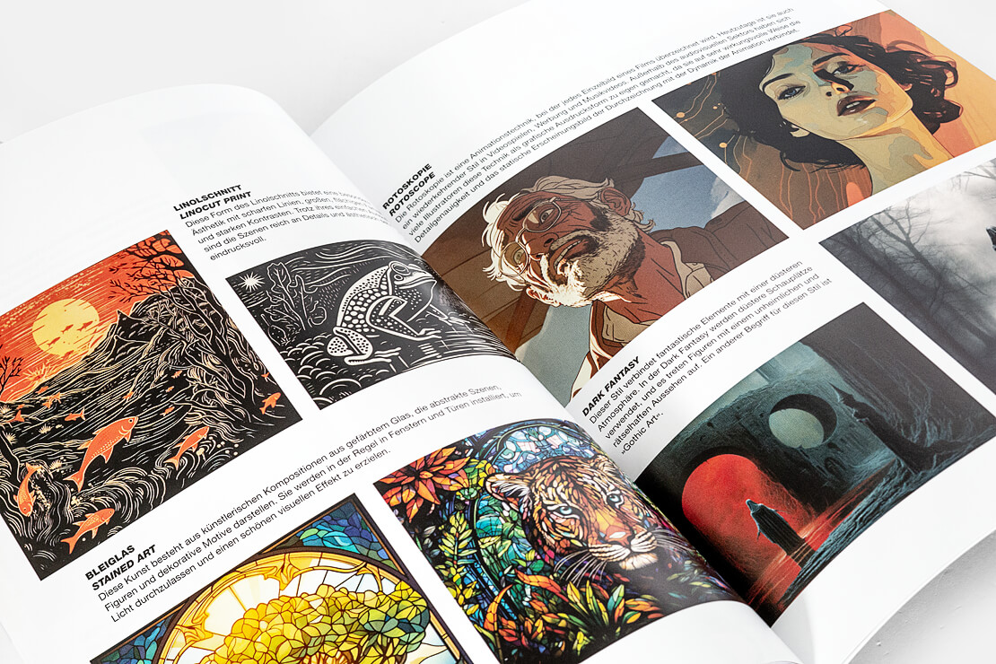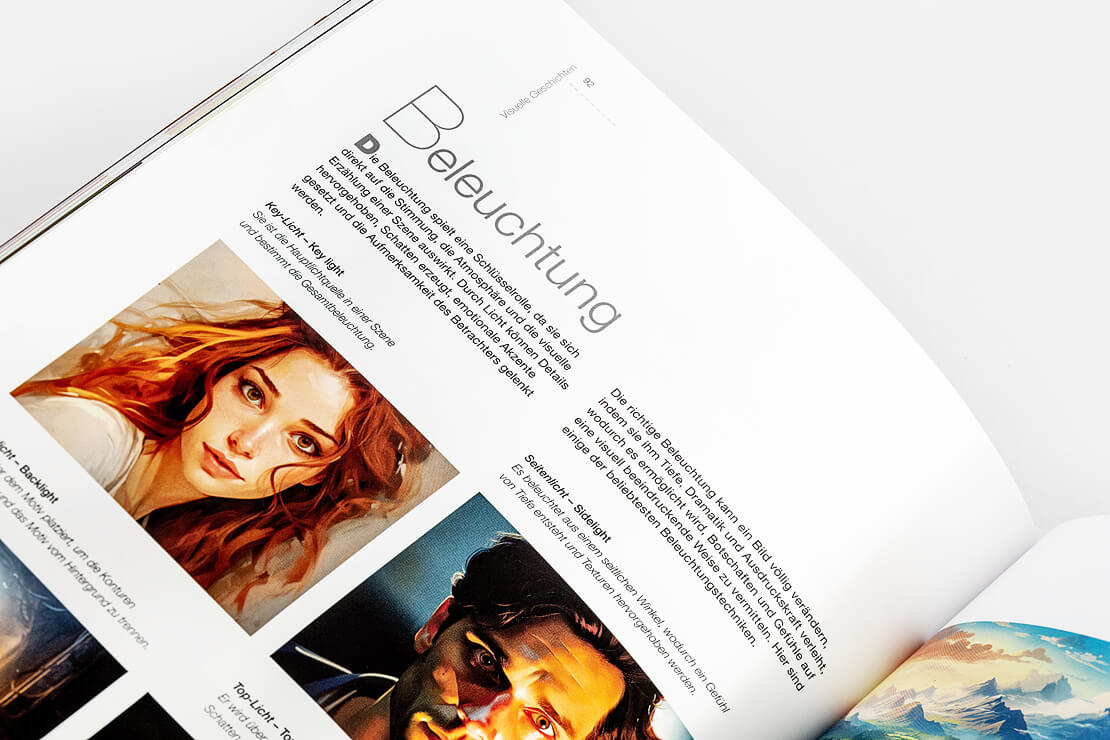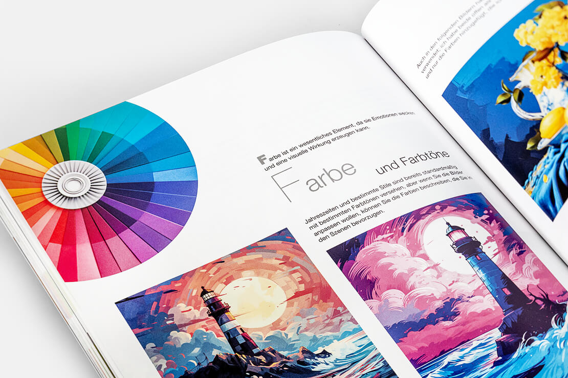 Zu den einzelnen Schlüsselwörtern werden passende Abbildungen und Hinweise zur Verwendung in Prompts gezeigt, sodass die Ergebnisse visuell nachvollziehbar sind. Diese KI-Schlüsselwörter funktionieren in der Regel gleichermaßen mit Midjourney, Stable Diffusion, Leonardo, DALL-E oder Adobe Firefly und führen zu vergleichbaren Ergebnissen.