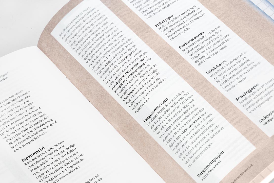 Alle Kapitel haben eins gemeinsam: sie erzählen ihre Themen entlang exemplarischer Einzelbeispiele oder Geschichten. Die Bereiche werden unterbrochen von den beiden Einschüben »Papiersorten von A bis Z« und »Papier-Wissen«. Somit wird auch zwischendurch praktisches Know-how über Papiere vermittelt.