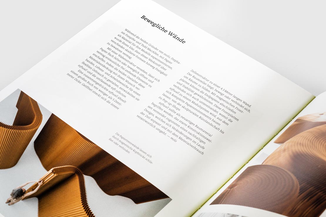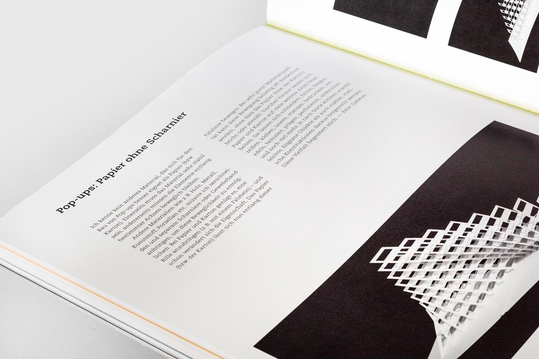 Neben dem Material wird ebenso auf die Rolle als Medium, die symbolische Funktion, die Gestaltung in der Fläche sowie die Faltung zum Volumen eingegangen. Was man über Papier wissen möchte, wird hier sozusagen offengelegt – das deutet nicht nur die offene Bindung des Buches an.