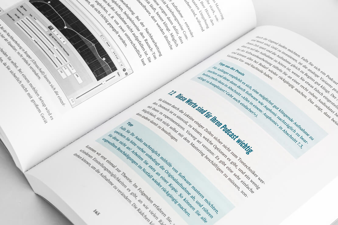 Die Kapitel zeigen, wie sich Podcasts planen, aufnehmen, schneiden, mastern und schließlich auch veröffentlichen lassen. Es geht beispielsweise um die Wahl des passenden Titels und des entsprechenden Formats, den richtigen Abstand zum Mikro, das Schneiden von Aufnahmen und vieles mehr.