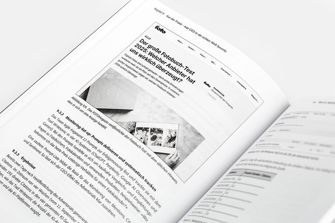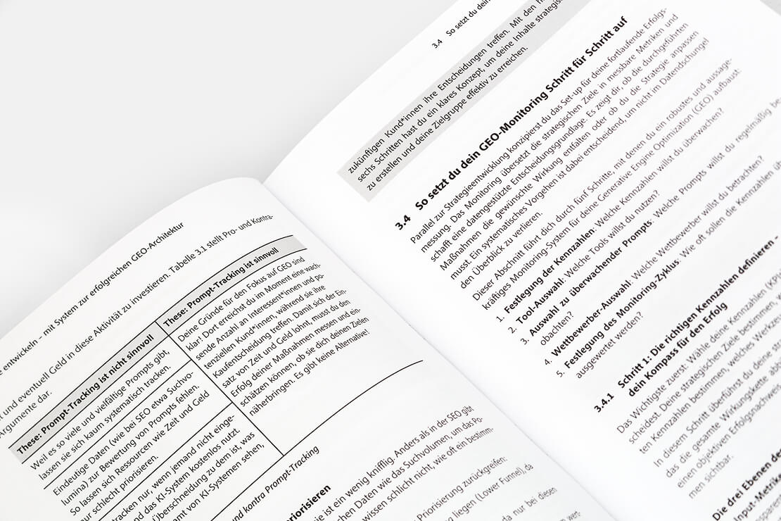 Neben der Content-Kreation widmet sich das Buch auch den technischen Best Practices und der Sichtbarmachung von Erfolgen. Leserinnen und Leser erfahren, wie sich GEO-Aktivitäten messen lassen und wie entsprechende Reports aufgebaut werden können. Ein Überblick über aktuelle Tools sowie Fallstudien aus der Praxis runden das Werk ab und schlagen die Brücke zwischen klassischer SEO und der neuen GEO-Realität.