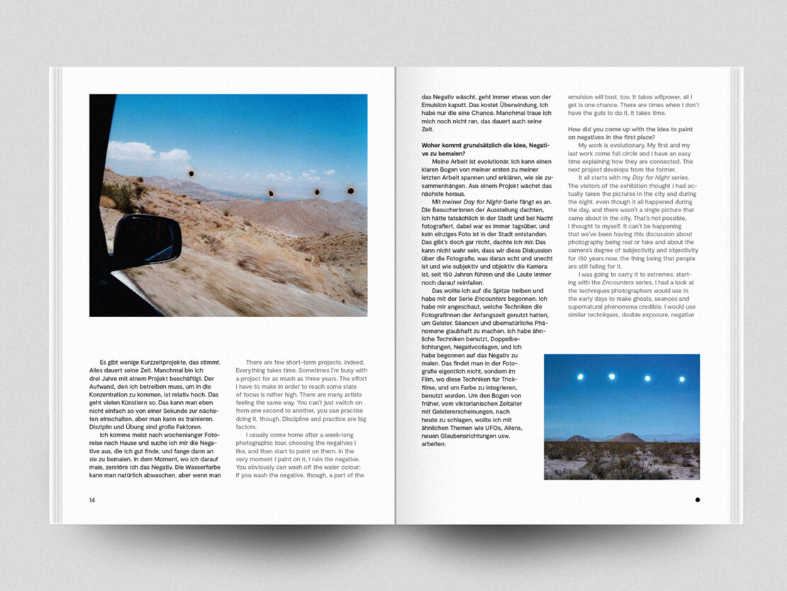 Jede Ausgabe zeigt vier ausführliche, tiefgehende Interviews mit ausgewählten Foto-KünstlerInnen, eine Reportage hinter den Kulissen und ein fotografisches Objekt im Detail.