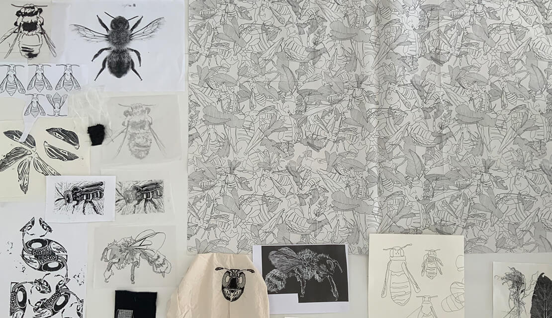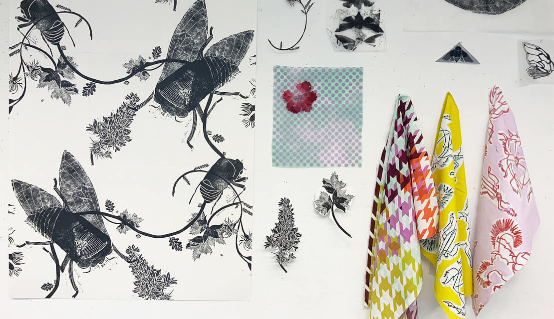 Dass man mit den konservierten Zikaden, Hirschkäfern, Bienen und Co. auch auf ganz andere Ideen kommen kann, zeigen jetzt Luzerner Textildesign-Studierende. Ihre Eindrücke vom Besuch der Sammlung setzten die Bachelor-Studentinnen und -Studenten in Form von Entwürfen auf Papier, Stickereien sowie Siebdrucken um.