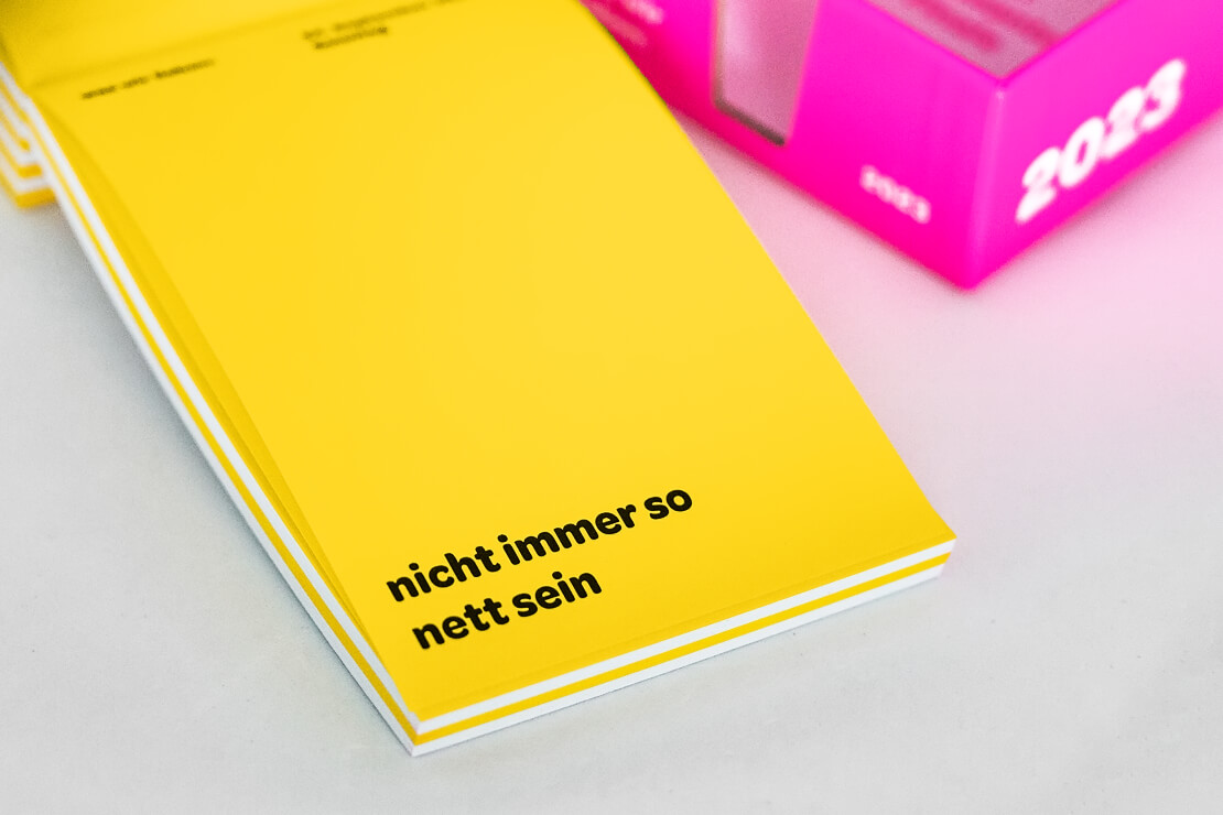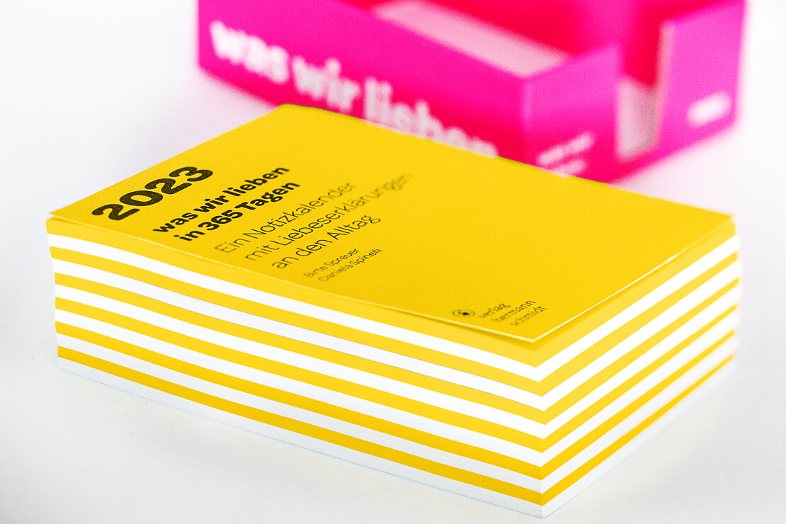 Für das Jahr 2023 kommen die Blätter des Kalenders im monatlichen Wechsel in Sonnengelb und Schneeweiß. Die mitgelieferte, pinkfarbene Box lässt sich zudem zum Sammeln der abgetrennten Seiten verwenden.