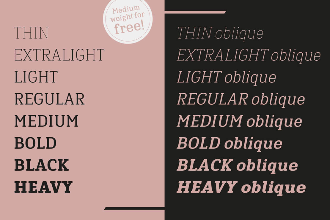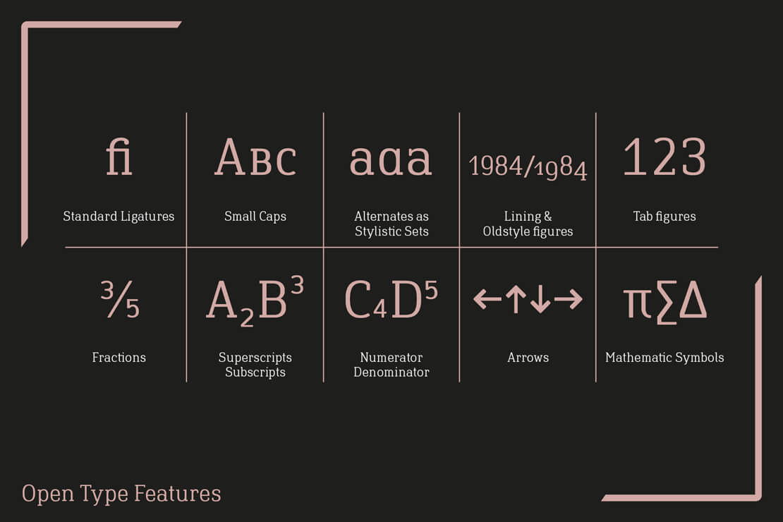 Die Schriftfamilie besteht, ebenso wie die Sans, aus 8 Gewichten, von Thin bis Heavy, plus der passenden Kursiven. Mit 900+ Glyphen pro Schnitt werden über 200+ lateinbasierte Sprachen abgedeckt. Beinhaltet ist zudem ein erweitertes Set an Währungssymbolen und weitere Open Type Features wie Small Caps, Ligaturen, Ziffernvariationen, automatische Brüche etc.