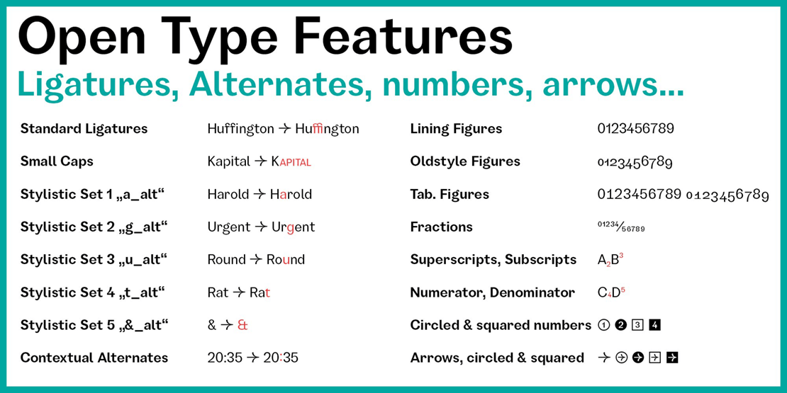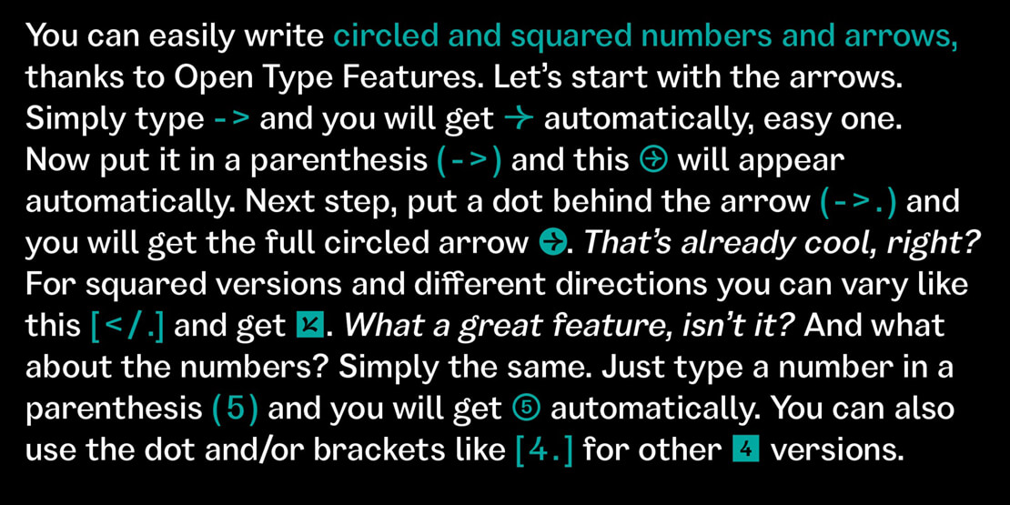 Ein besonderes Augenmerk hat Julien Fincker zudem auf die umfangreiche Auswahl an Pfeilen und Nummern gelegt. Durch Opentype-Features und einer einfachen Systematik lassen sich die entsprechenden Ausführungen auch einfach direkt »schreiben«, ohne sie zuvor in einer Glyphen-Palette auswählen zu müssen.