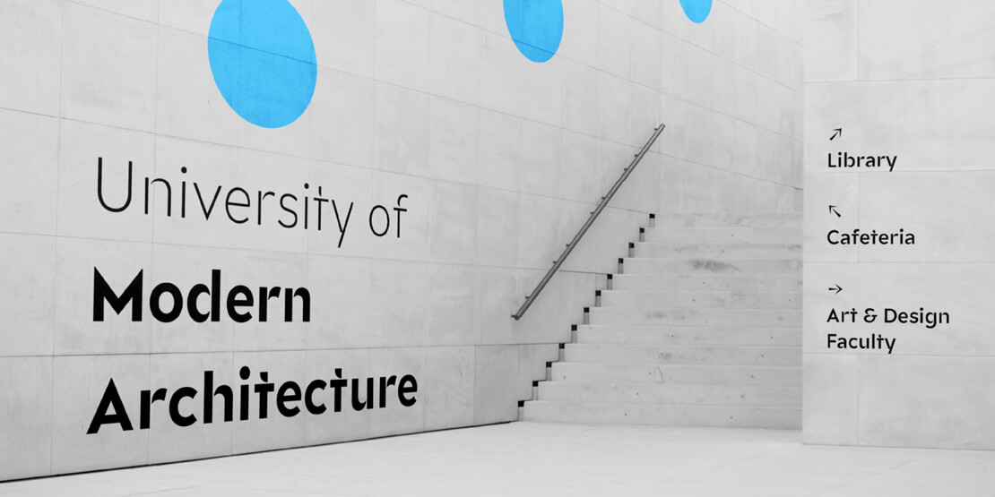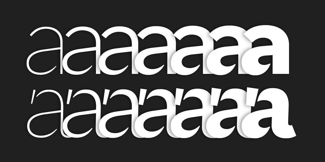 Einige Striche der Schriftart verbinden sich nicht mit ihren Buchstabenstämmen, wodurch sichtbare Lücken entstehen und somit ein dynamischer Eindruck von Balance und Bewegung entsteht.