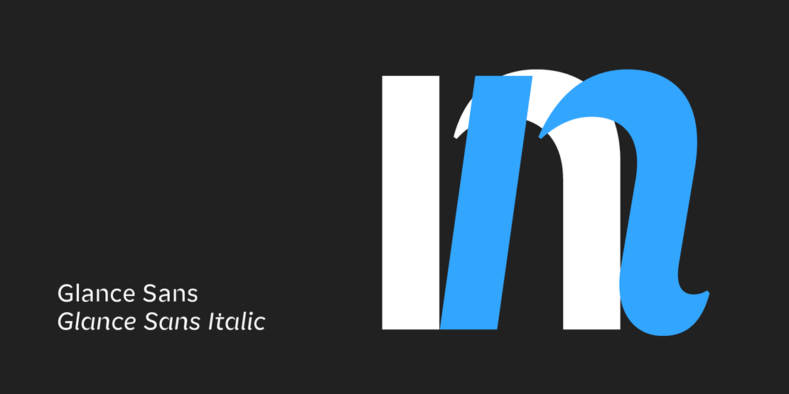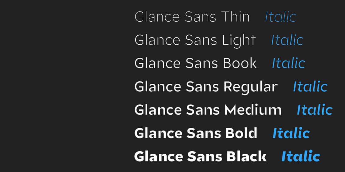 Glance Sans bietet sieben Schnitte sowie einen kompletten Satz Italics. Dabei handelt es sich nicht nur um schräggestellte Variante, sondern um individuell gezeichnete Buchstabenformen, die eher subtil auf die klassische Kursivkonstruktion verweisen, um damit eine effektivere Betonung erzielen zu können.