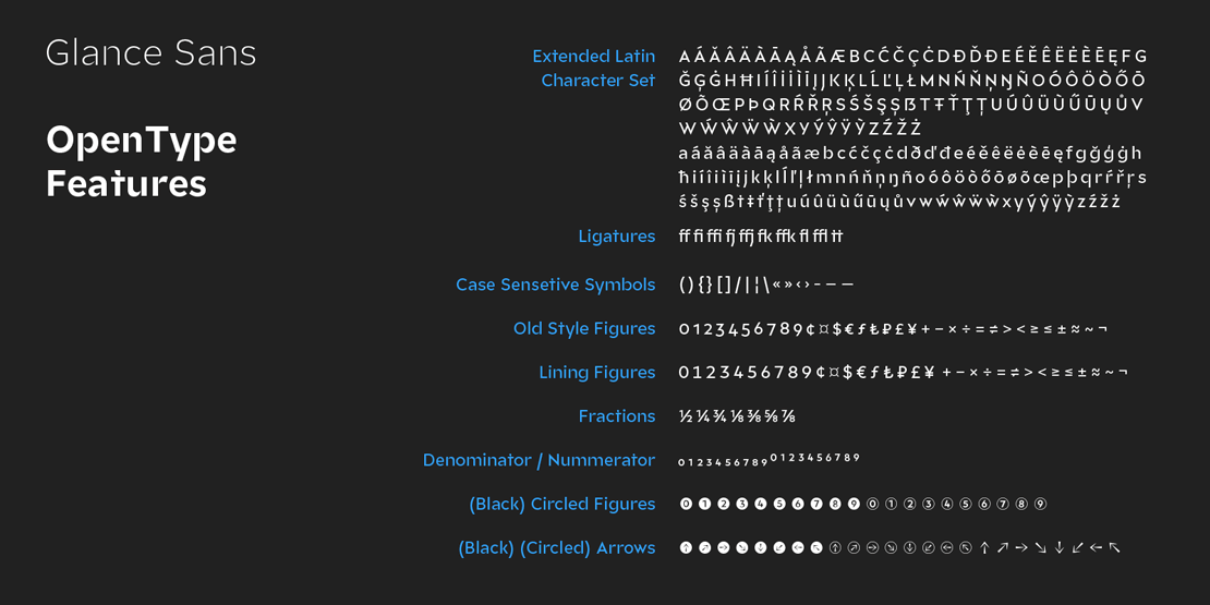 Unter den mehr als 600 Glyphen der Glance Sans finden sich Extras wie sechs Ziffernsätze, eingekreiste Zahlen, eingekreiste Pfeile und weitere Arten von Währungssymbolen in zwei stilistischen Versionen.