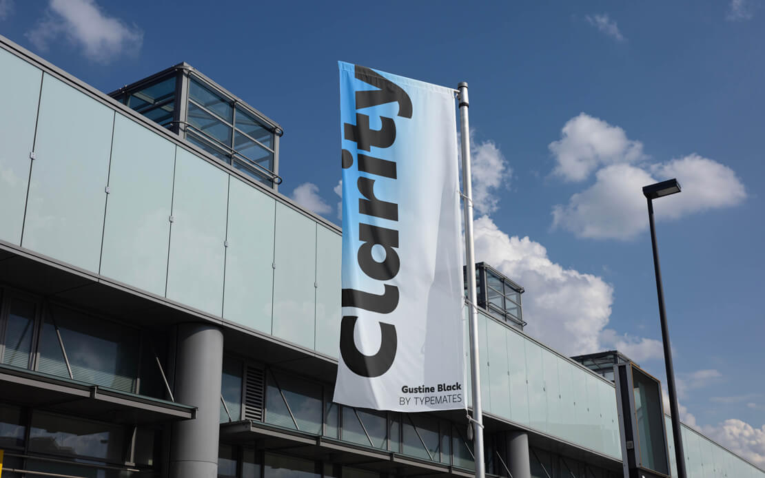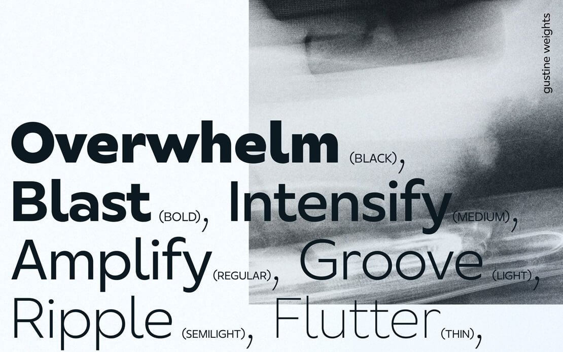 Gustine kombiniert breite Proportionen, präzise Rundungen und kantige Abschlüsse zu einer Schrift, die sich gleichermaßen für Fließtext, digitale Anwendungen und Beschilderungen eignen kann. Neben sieben Strichstärken bietet sie eine Auswahl alternativer Zeichenformen sowie einen erweiterten Zeichensatz für über 200 Sprachen.