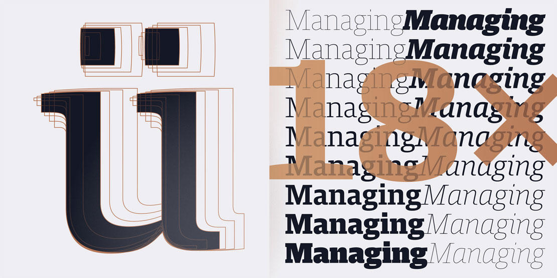 Die Harrison Serif Pro von Jakob Runge und Lisa Fischbach ist eine robuste Slab Serif mit dezentem Strichstärkenkontrast, die Rationalität mit einem freundlichen Ton kombinieren soll. Die leicht gebogenen und teils stark betonten Serifen zeigen die sanfte Seite der Harrison Serif die im Kontrast zur gradlinigen Struktur der fast schon eckigen Innenformen, den offenen Punzen und der starken Betonung der Horizontalen steht.