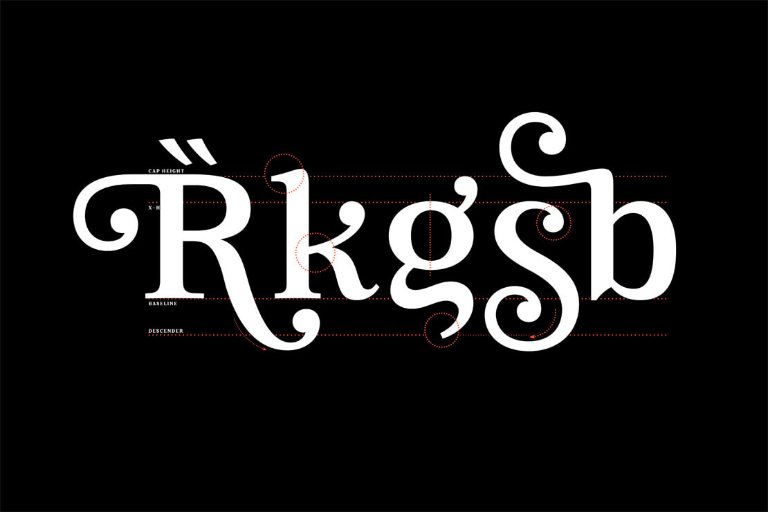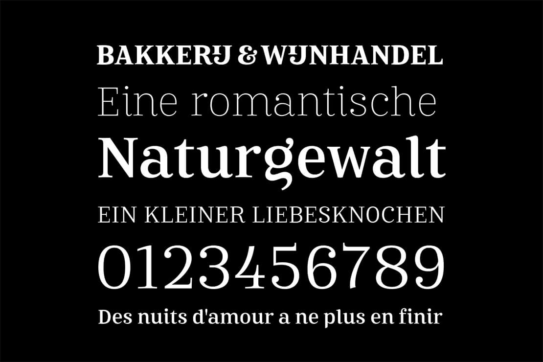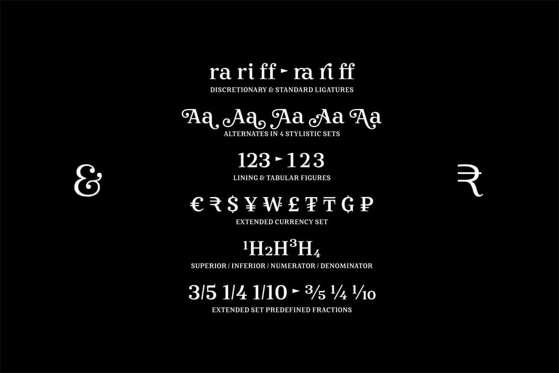 Die Schriftfamilie von Anita Jürgeleit kommt mit über 100 Ligaturen und dekorativen Zeichen. Über 1.000 Glyphen bedienen alle europäisch-lateinischen Sprachen. Die zusätzlichen 4 Stylistic-Sets verfügen zudem über alternative Zeichen, Ligaturen und erweiterte Nummern- und Währungssets.