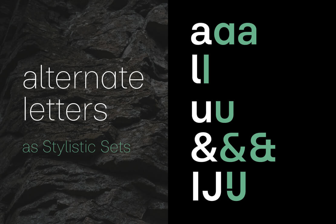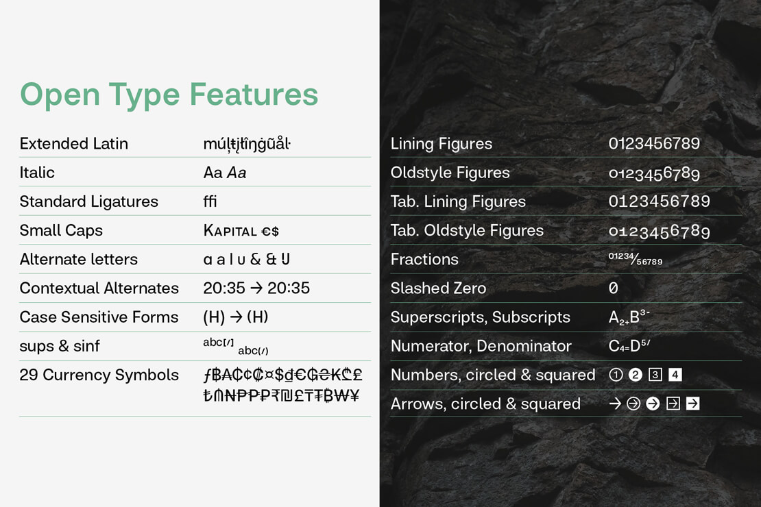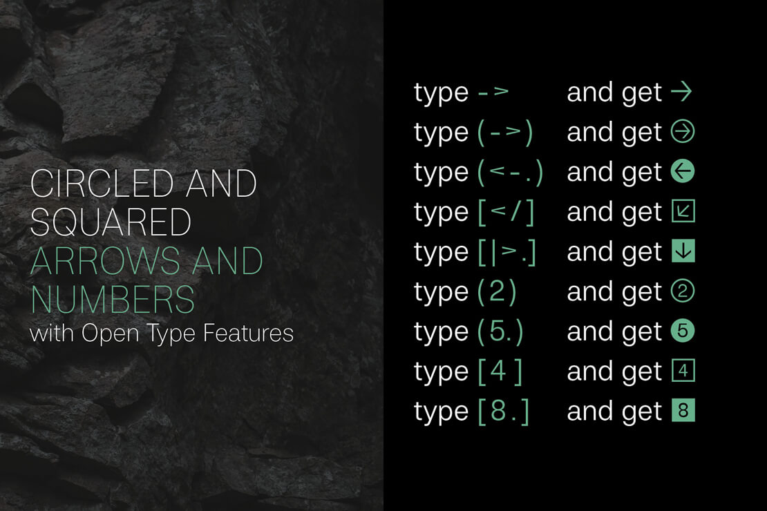 Für die umfangreichen Einsatzzwecke wurde die Zeichenpalette deutlich erweitert. Die Schriftfamilie verfügt unter anderem über schreibbare Pfeile, Zahlen in Kreisen und Quadraten, viele Währungszeichen sowie eine breite Auswahl an hoch- und tiefgestellten Zeichen. Außerdem stehen OpenType-Features wie Kapitälchen, Brüche und verschiedene Ziffernsets zur Verfügung.