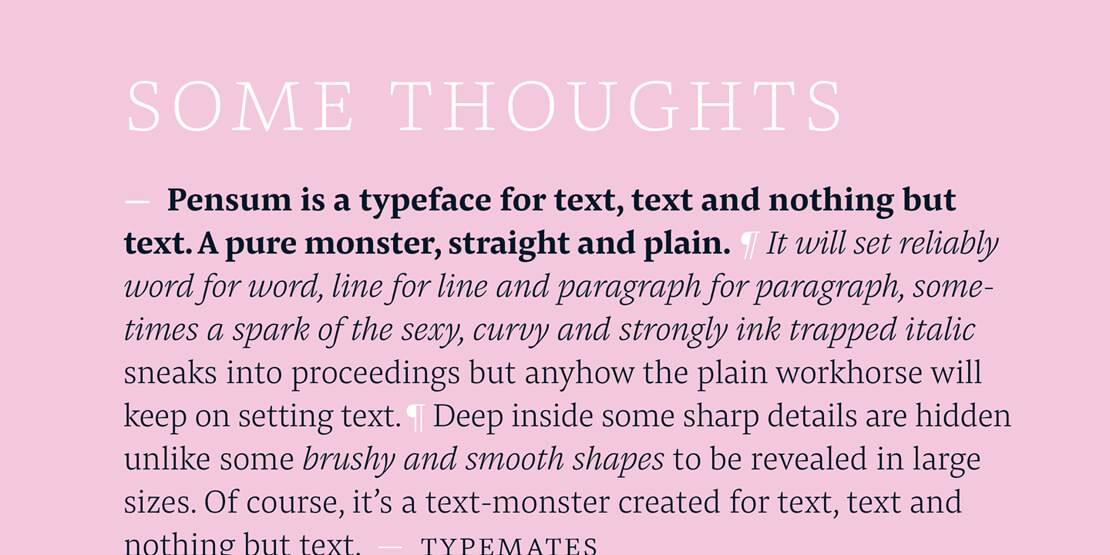 Bei den TypeMates aus Hamburg ist »Pensum Pro« von Nils Thomsen erschienen: eine Breitfeder und Pinsel inspirierte Schriftfamilie mit neun Gewichten, die sich auch für lange Lesetexte eignet.