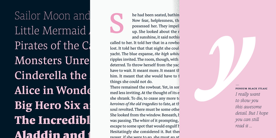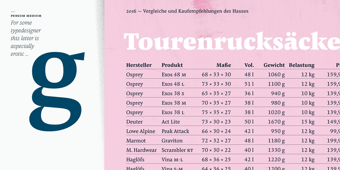 Die neun Gewichte von »Pensum Pro« reichen von »Thin« bis »Black« und lassen sich unter anderem in Magazinen, Büchern und Co. verwenden. Die Schriftfamilie beinhaltet rund 1.050 Zeichen sowie OpenType-Features – von Kapitälchen für Buchliebhaber bis hin zu Satzzeichen, die sich entsprechend dem Versal- oder Kapitälchensatz anpassen.