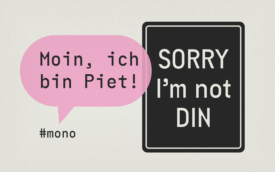 Die von Nils Thomsen gestaltete Piet umfasst zwei Schriftarten: die MONO und die Sans. Sofern die MONO für den geplanten Einsatz zu streng erscheinen sollte, bietet die Sans die Möglichkeit, eine Stufe lässiger zu werden.