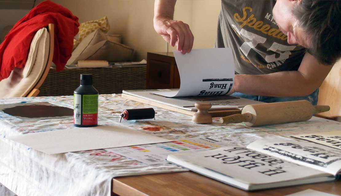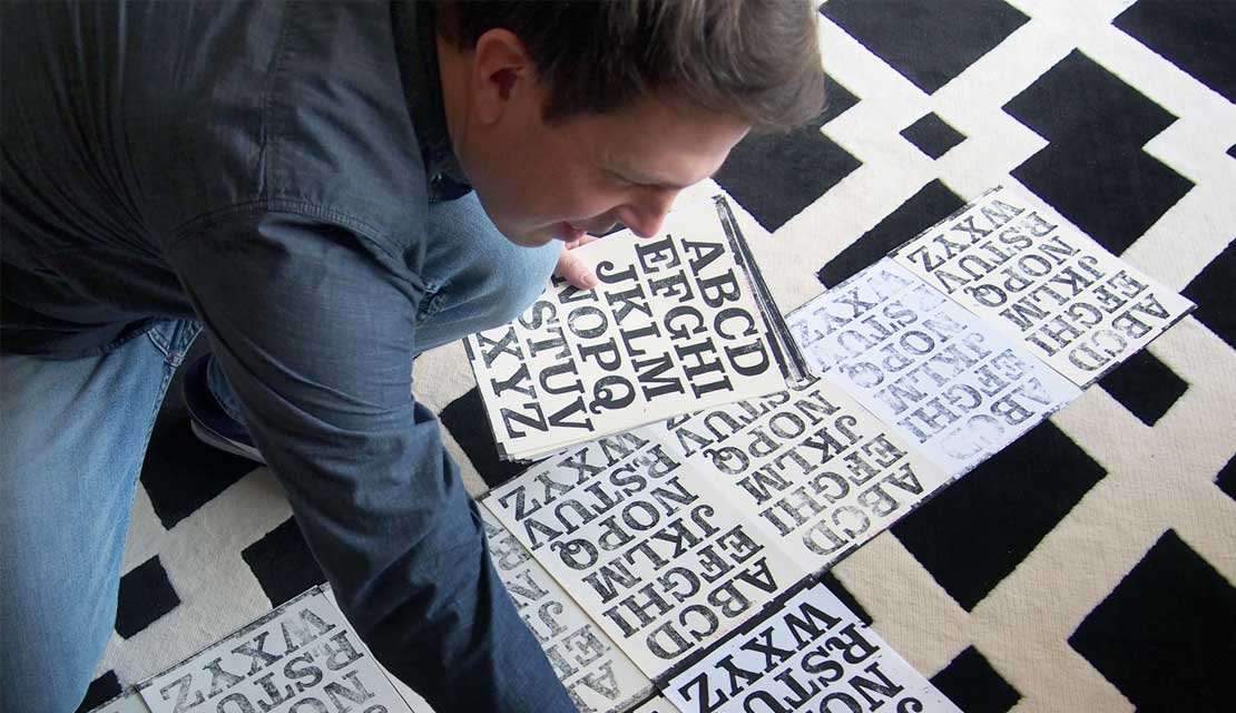 Nach Testläufen mit verschiedenen Materialien und Größen, entschied er sich für einen Holzschnitt mit einer Schriftgröße um 150 Punkt und schnitt einen kompletten Schriftsatz auf fünf Druckplatten. Auch beim Papier waren viele Testdrucke erforderlich. Jede Platte wurde in einer Auflage von 30 Stück gedruckt und jeweils vier Qualitäten für die Digitalisierung gewählt: Ein normaler Druck, einer mit halber Kraft und zwei Folgedrucke ohne neuen Farbauftrag.