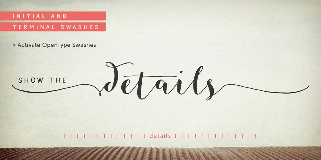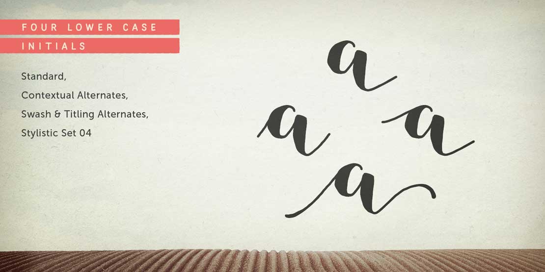 Der Clou an der Vielfalt: die Schrift entscheidet selbst, welche Variante gerade am besten passt. Wortanfang und Wortende lassen sich mit 17 verschiedenen Schwüngen betonen und automatisch mit den Kleinbuchstaben verbinden. Auch einzelne Worte können miteinander in 10 Varianten zusammengesetzt werden.