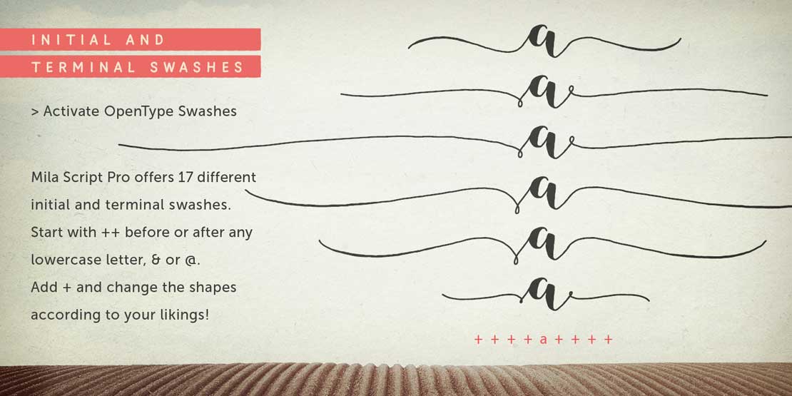 »Mila Script Pro« und »Basic« unterscheiden sich hinsichtlich der Ausstattung der OpenType-Features. Die Basic-Version mit etwas mehr als 900 Glyphen bietet dezente Schwünge, Positionalformen, Ligaturen sowie eine Auswahl von verbundenen und nicht verbundenen Glyphen.