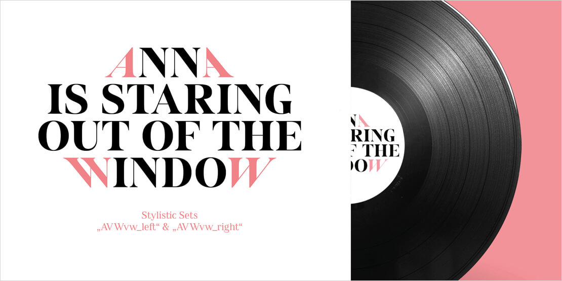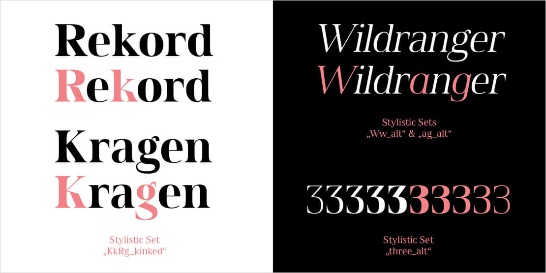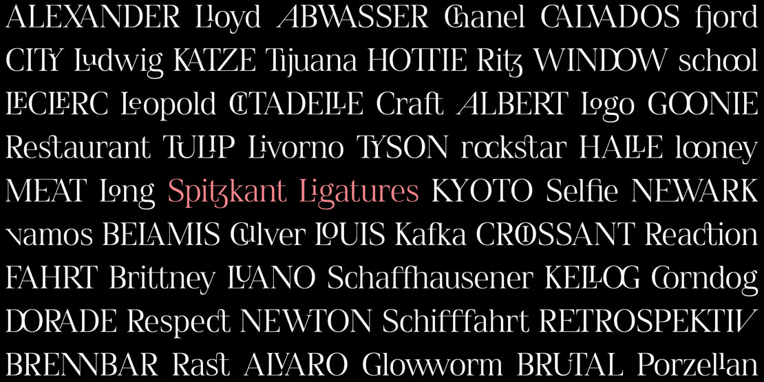 Der kontrastreichen Display-Variante wurde eine kontrastärmere Text-Variante beigestellt, sodass Spitzkant in Kombination sowohl für starke Headlines als auch für umfangreiche Fließtexte geeignet ist. Mit über 95 verschiedenen Ligaturen bieten sich viele Möglichkeiten, Headlines und Logos eine individuelle Note zu geben.