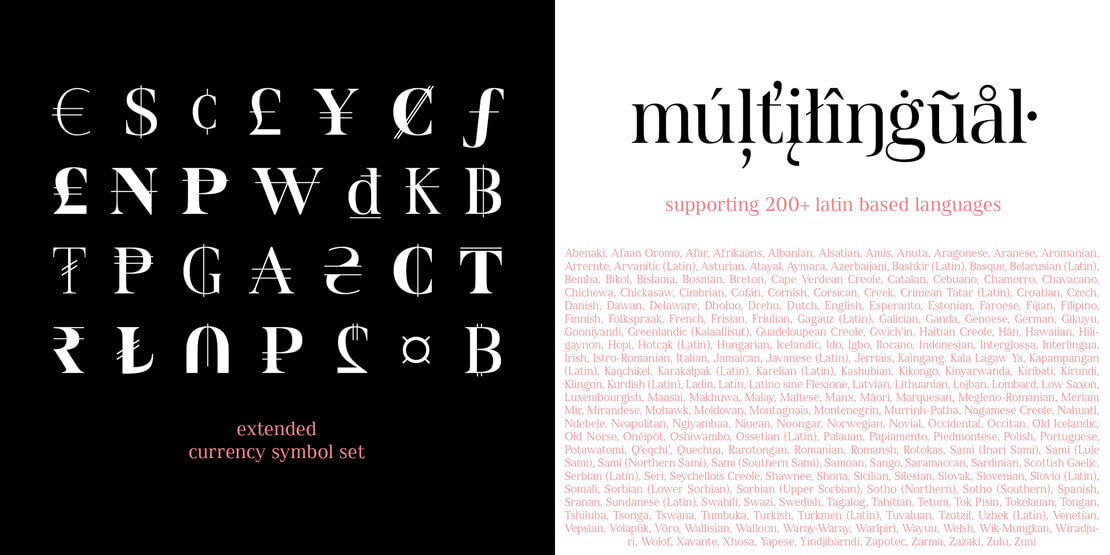 Mit über 850 Zeichen deckt sie über 200 lateinbasierte Sprachen ab. Sie verfügt dabei über eine Vielzahl an Währungszeichen und Open Type Features. Es gibt beispielswiese alternative Zeichen als Stylistic Sets, Small Caps, automatische Brüche und weitere Features.