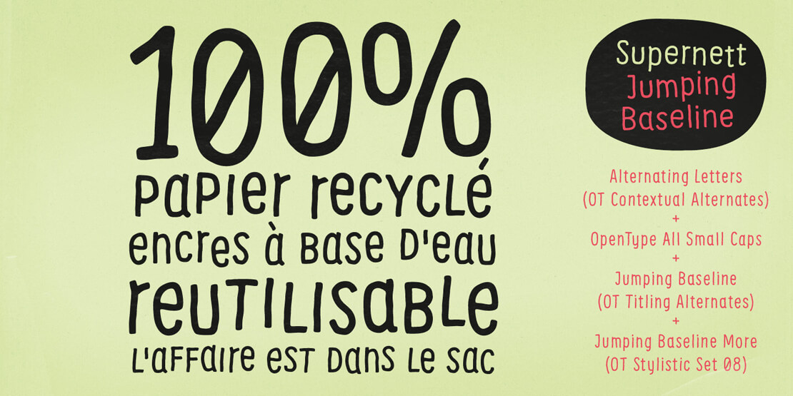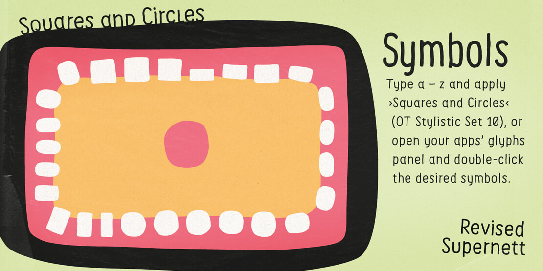 Für jeden der Schnitte liegen die Buchstaben und Ziffern jeweils in drei Varianten vor. Eines der Hauptmerkmale von »Supernett« ist außerdem das »Wackeln und Zappeln« von Zeichen, das für Variationen im Schriftbild sorgt.
