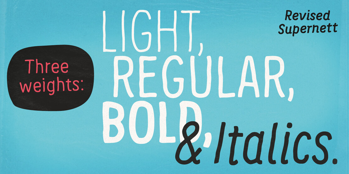 Die Schrift gibt es in »Light«, »Regular« und »Bold« mit ergänzenden Italics-Fonts. Außerdem steht die »Supernett« als Condensed-Variante ebenfalls in »Light«, »Regular« und »Bold« mit entsprechenden Kursiven bereit.