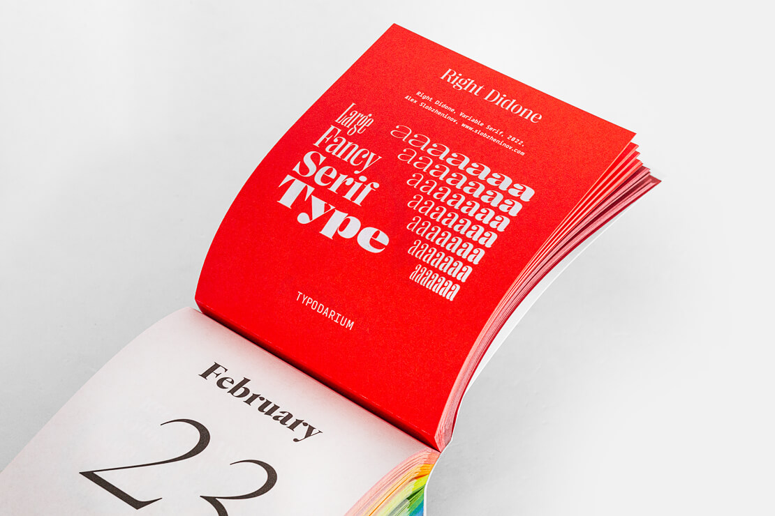 Seit seiner Erstausgabe im Jahr 2008 hat sich das Typodarium weltweit zu einer Art »Jahrbuch mit aktuellen Typedesigns« entwickelt und einen festen Platz auf den Tischen von Designern und Typografie-Enthusiasten erobert. In der neuen Ausgabe setzt das »Typodarium 2024« den Fokus auf Diversität in all ihren Facetten und lädt dazu ein, neue Beziehungen durch die Kunst der Typografie zu gestalten. Die Gestaltung wurde diesmal von Julia Uplegger übernommen.