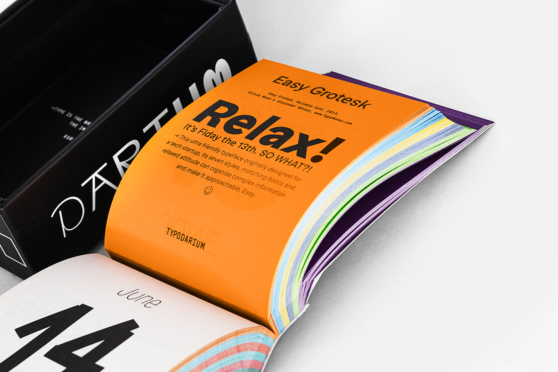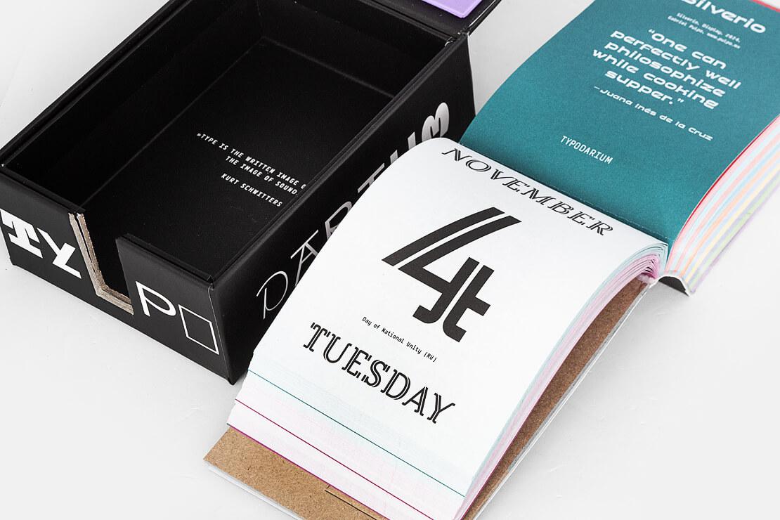 Im »Typodarium 2025« gibt es insgesamt 365 Schriftarten von 357 Typedesignern aus 41 Ländern zu entdecken. An jedem Tag des Jahres wird eine neue Schriftart vorgestellt. Auf der Rückseite jeder Kalenderseite finden sich zusätzliche Informationen zu den Schriftarten, den Designern und dem jeweiligen Entwicklungsjahr. So wird das »Typodarium 2025« nicht nur zum täglichen Begleiter, sondern auch zu einem hilfreichen Nachschlagewerk für Schriftliebhaber.