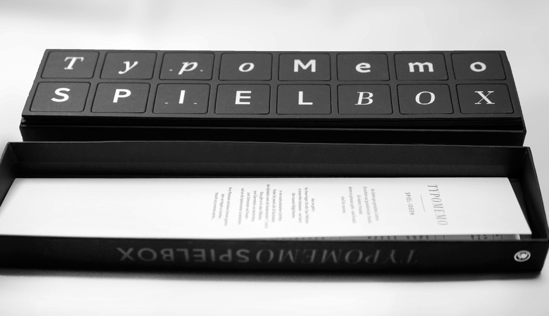 Spiel-Ideen werden in der Spielbox mitgeliefert. Die Varianten reichen von »Typomemo«, »Typo-Mau-Mau« bis hin zu »Typoesie«. Außerdem lassen sich mit etwas Fantasie eigene Regeln und Ideen umsetzen, um beim Spiel typografische Details zu entdecken oder zu verstecken.