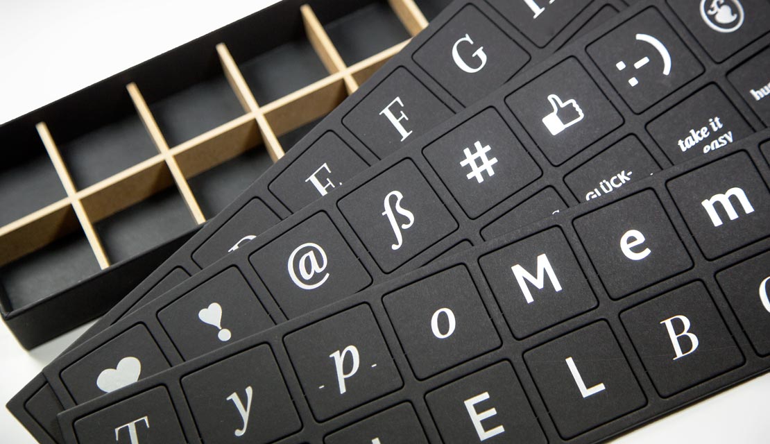 Die Typo-Täfelchen haben jeweils eine Größe von 37 x 37 mm und werden zusammen mit einem Panorama-Setzkasten geliefert, der 350 x 100 mm groß ist. Für 35 Euro ist die »TypoMemo Spielbox« im Handel erhätlich.